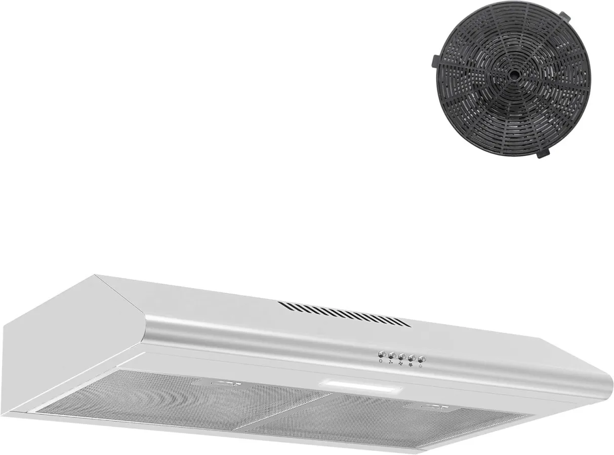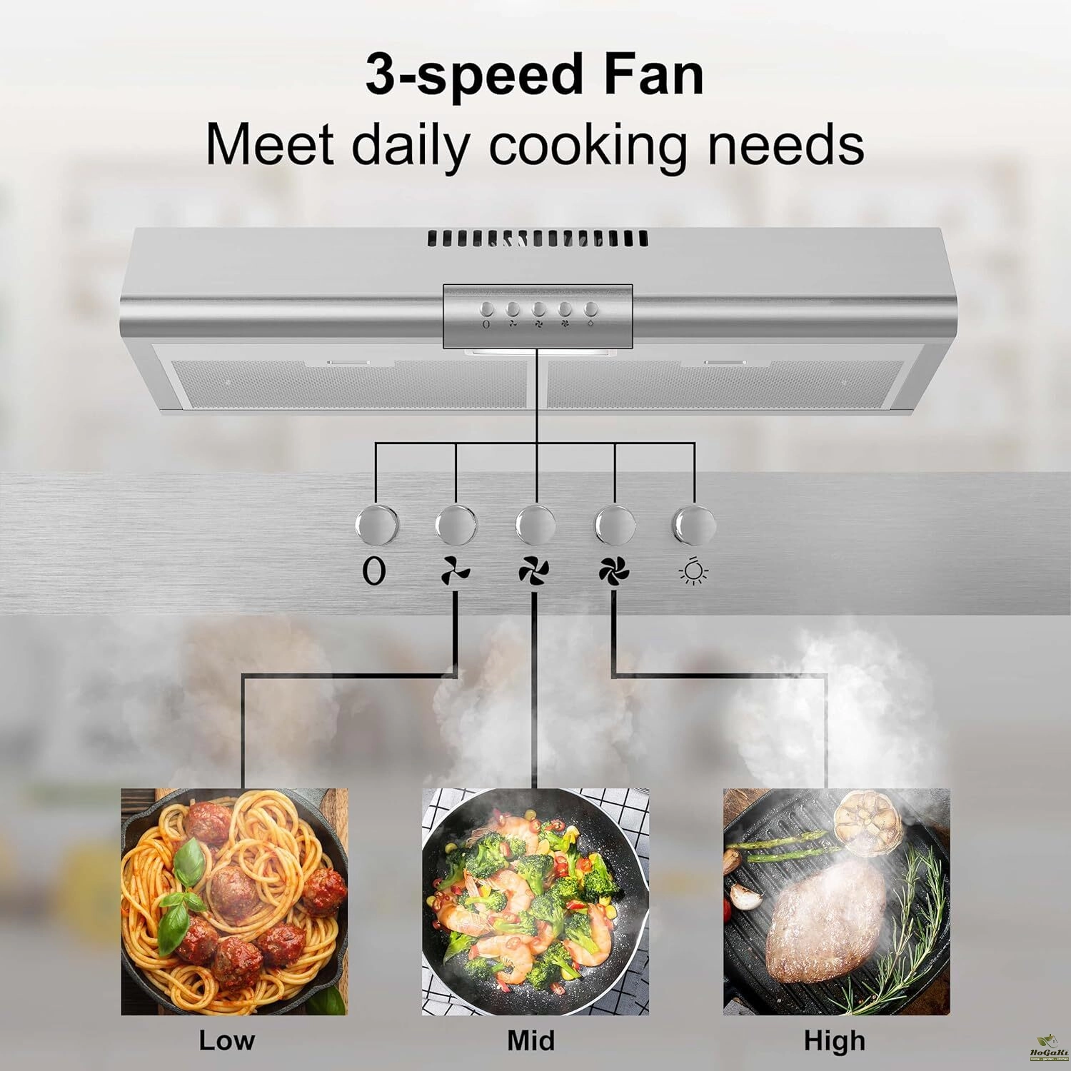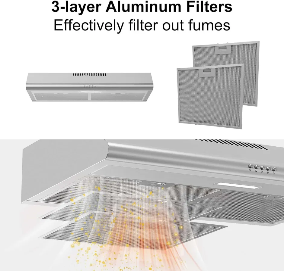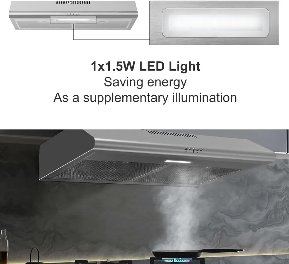 3 Speed for optional to change air flow to meet most cooking request,effectively remove fumes and odors;Push button control,can control operation of vent hood easily;2 reusable aluminum filters,to prevent capture grease from entering the interior of the kitchen range hood;A LED light in the front,give the extra illumination for your cooking area.