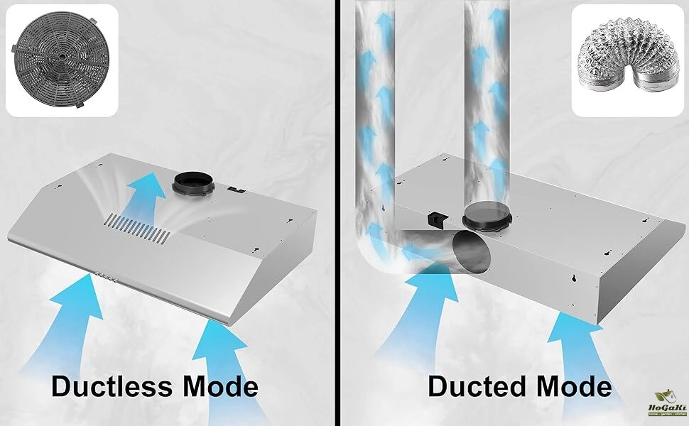 Default to ductless mode,the kitchen hood comes with a carbon filter,suggested that to replace it about every 3 months to ensure suction as well as removal of smoke and odor effectively,part #CF-3275.Can be converted to ducted mode by installing an aluminum foil pipe(NOT included,need to purchase separately if request it).