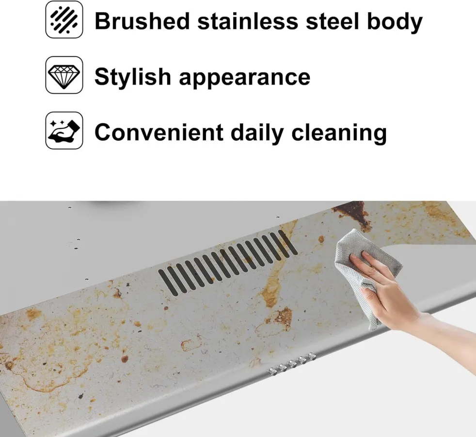 Made of premium 430 grade stainless steel,brushed finish,simple and attractive kitchen hood, perfect for modern kitchen style.High quality materials make the vent hood easier and time-saving to clean.Some areas are covered with protective film (white or blue), please remove it before installation or use.