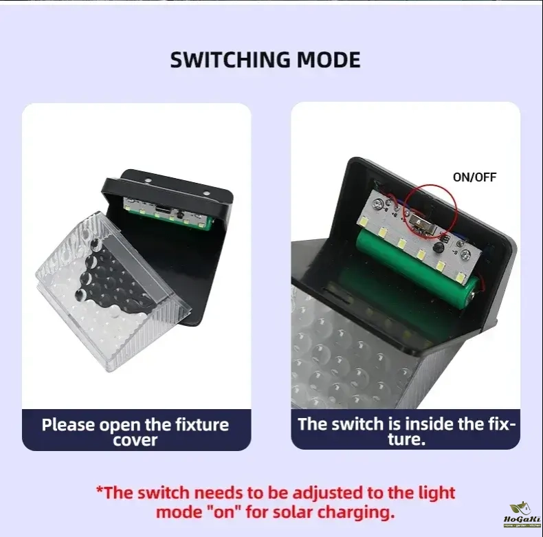 4. 3 Lighting Modes: (1). Induction mode (the light goes out 20-25s after the person comes and highlights) (2). Induction + slightly bright mode (people come to highlight, people go slightly bright, slightly bright 10% brightness) (3). No induction mode, 50% light 5. Battery life: charge for 6-8 hours in the daytime, 50 times per night