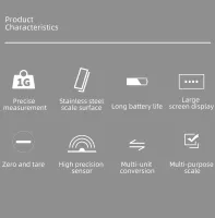 TARE function, multiple units conversion (g, oz, ozt, dwt, gn and ct), pieces counting, blue back-lit display, considerate overload indication and low battery indication.