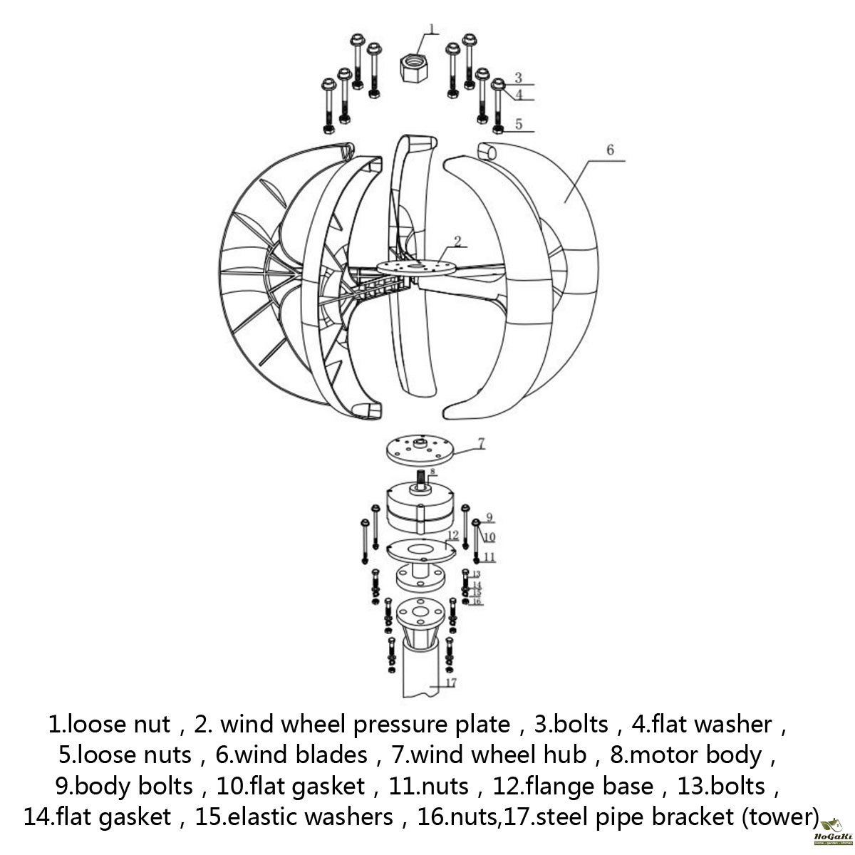1.wind turbine 1set(hub,tail, blades,generator,hood,bolts and nuts)