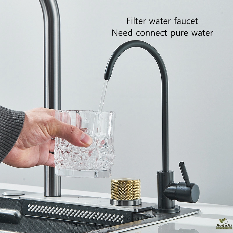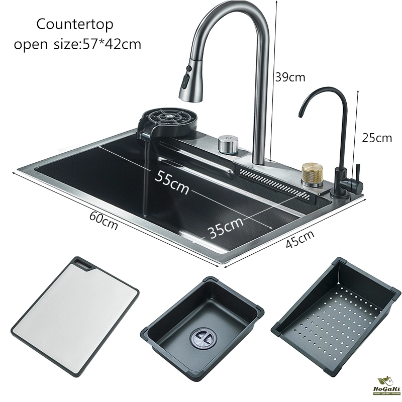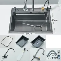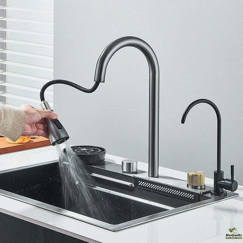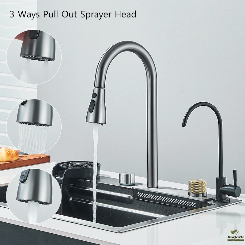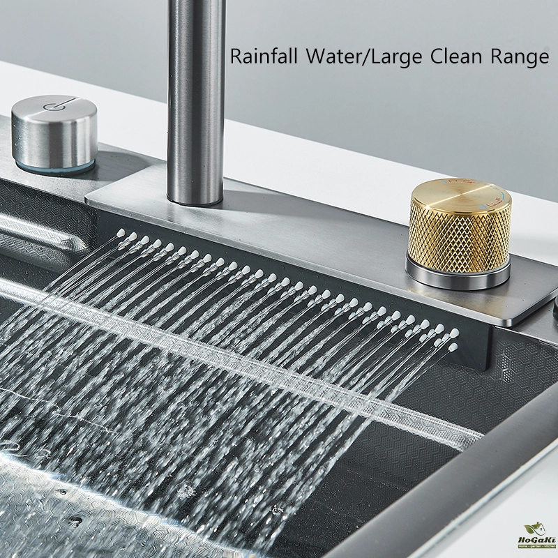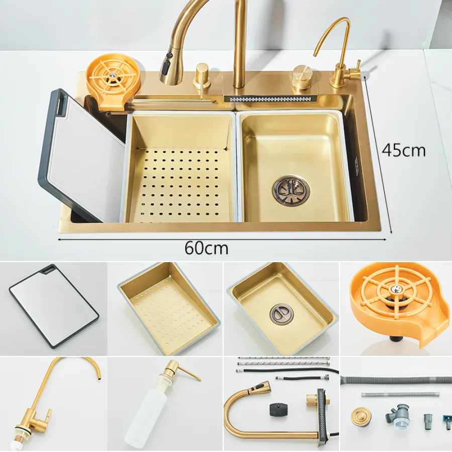 White Nano Stainless Steel Kitchen Sink Double Waterfall Integrated Digital Display Faucet Set Soap dispenser Cup Washer Crane