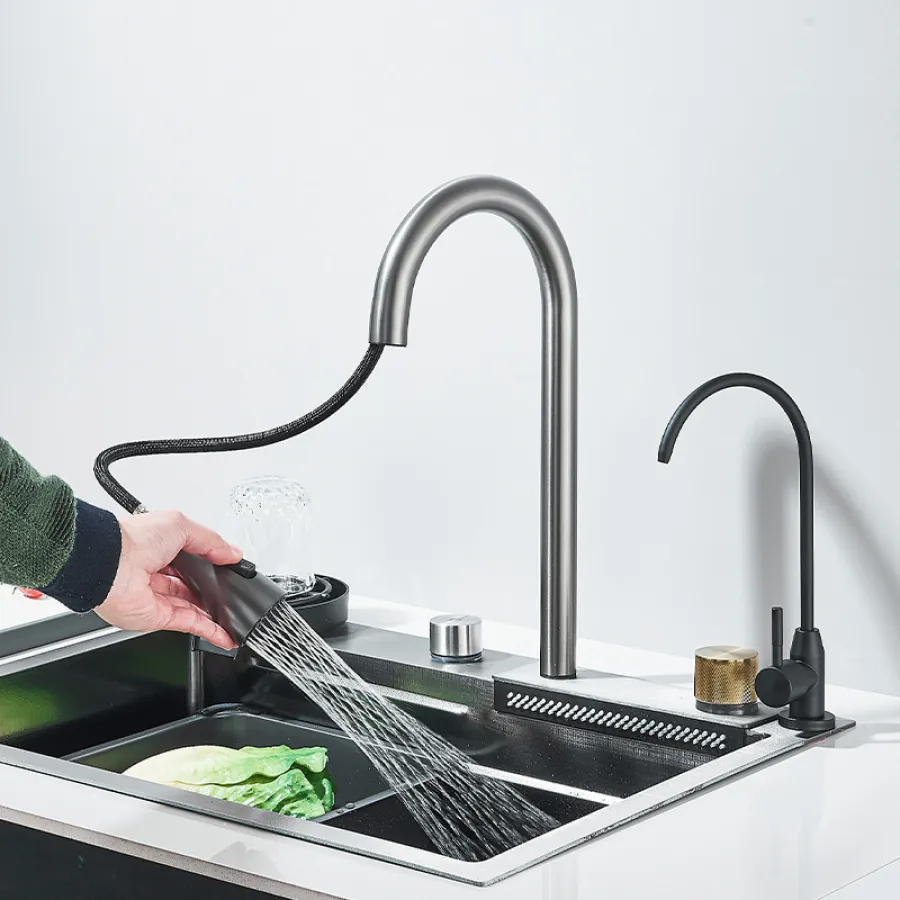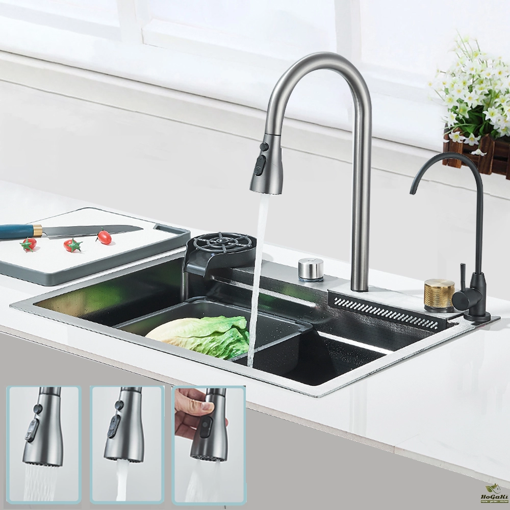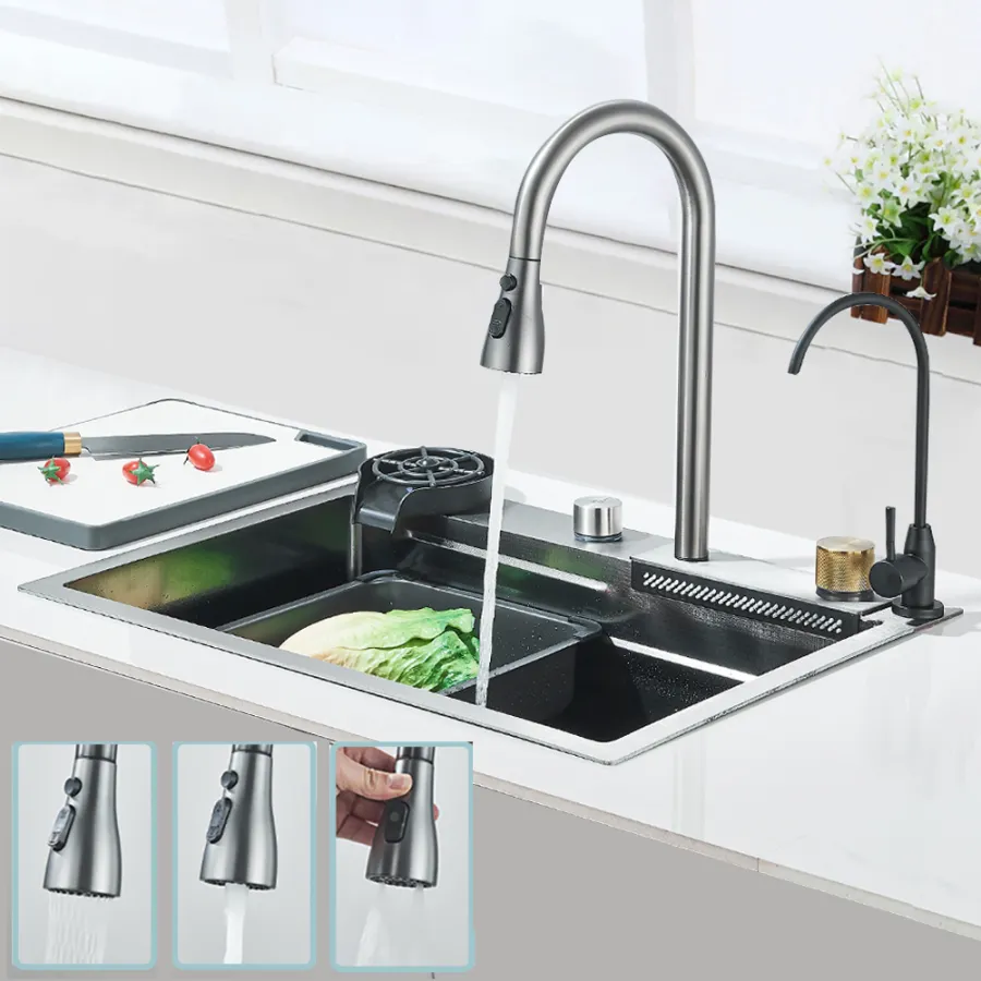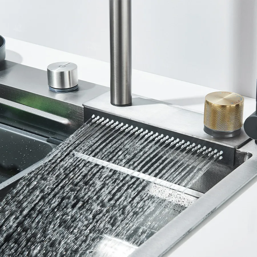 Gold Multifunctional Kitchen Waterfall Sink Digital Display Large Single Sink Dish Basin Sink 304 Stainless Steel