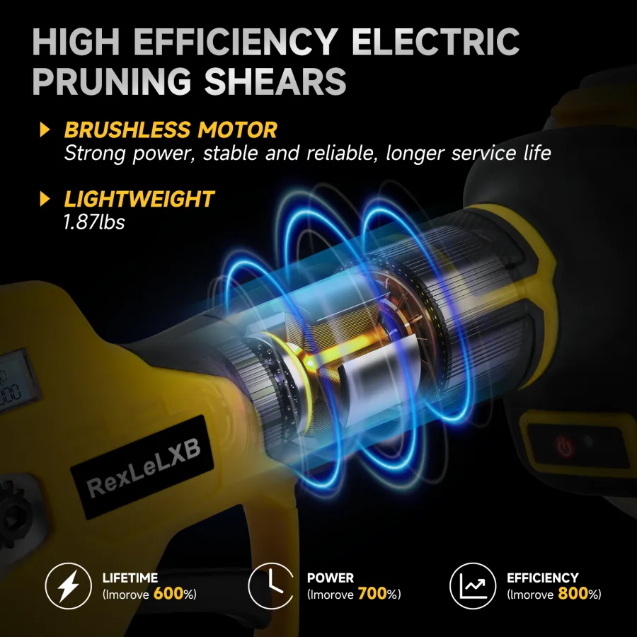 【480W Powerful Energy Brushless Motor】Electric Pruning Shears is equipped with a brushless motor. Compared with a pure copper motor, the lifetime of the brushless motor is improved by 600%, the output power is improved by 700%, the efficiency is improved by 800%. It brings stronger kinetic energy with lower energy consumption, allows you to work with ease every time.