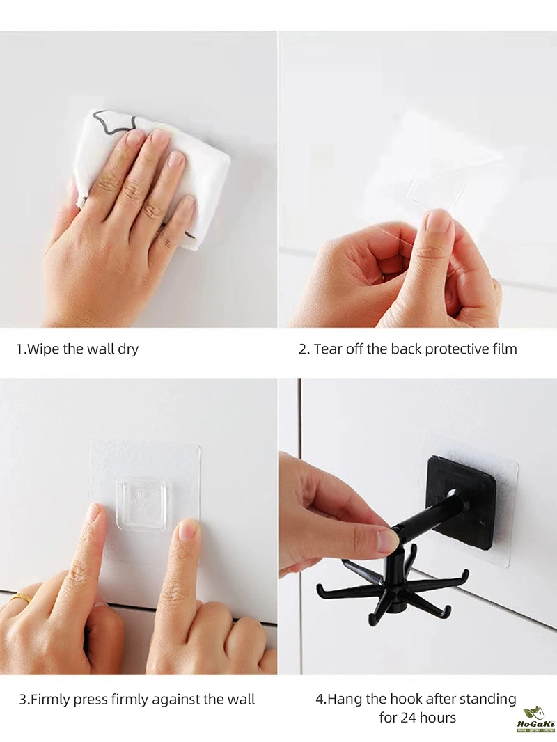 Installation process: Find a clean and flat wall and wipe it clean, then apply the patch, then connect the hook after 24 hours, and use the hook to hang the object after a day.