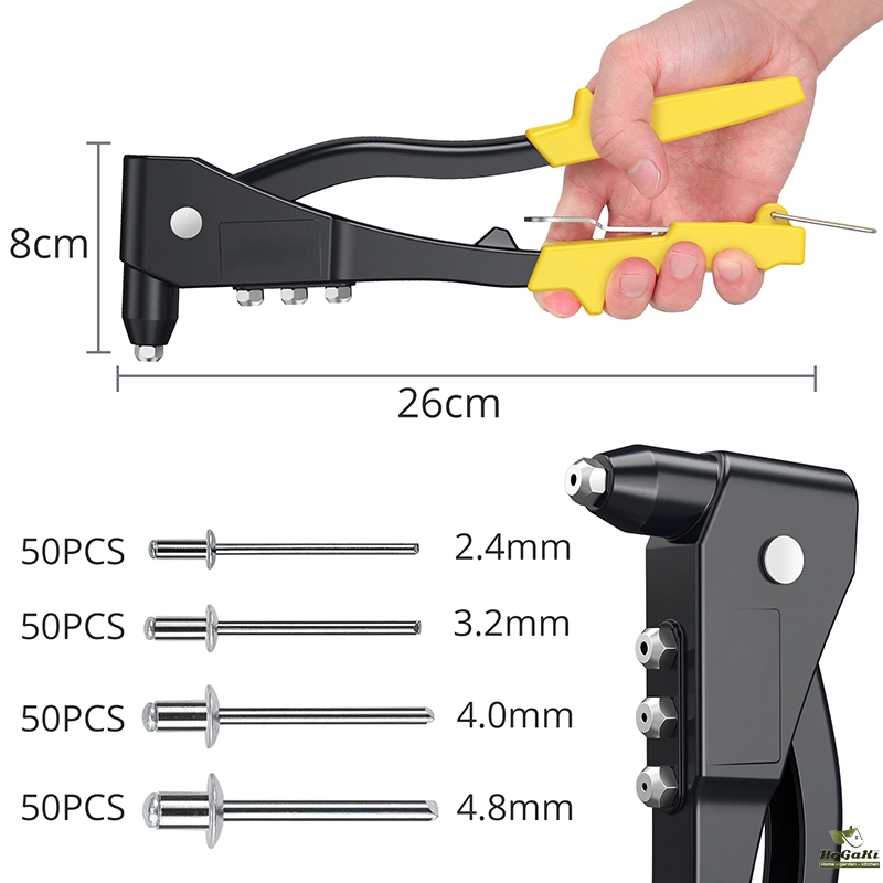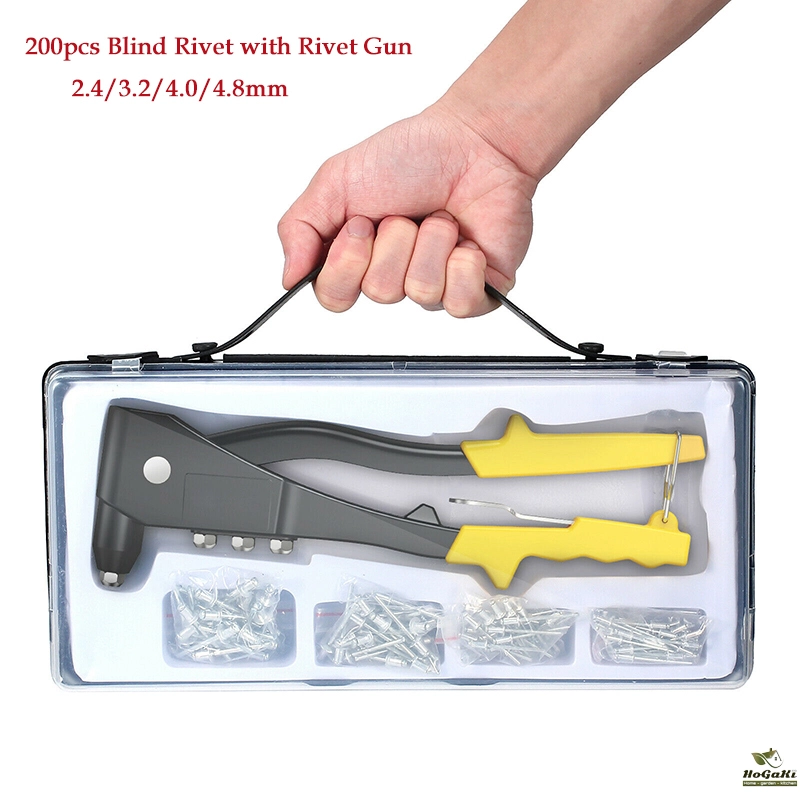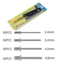 【200 pcs rivets】 Blind rivet set has a total of 200 pcs rivets, which are available in four different sizes 2.4 mm, 3.2 mm, 4.0 mm, 4.8 mm. When using, please select the corresponding guide in the accessories for the blind rivet pliers.