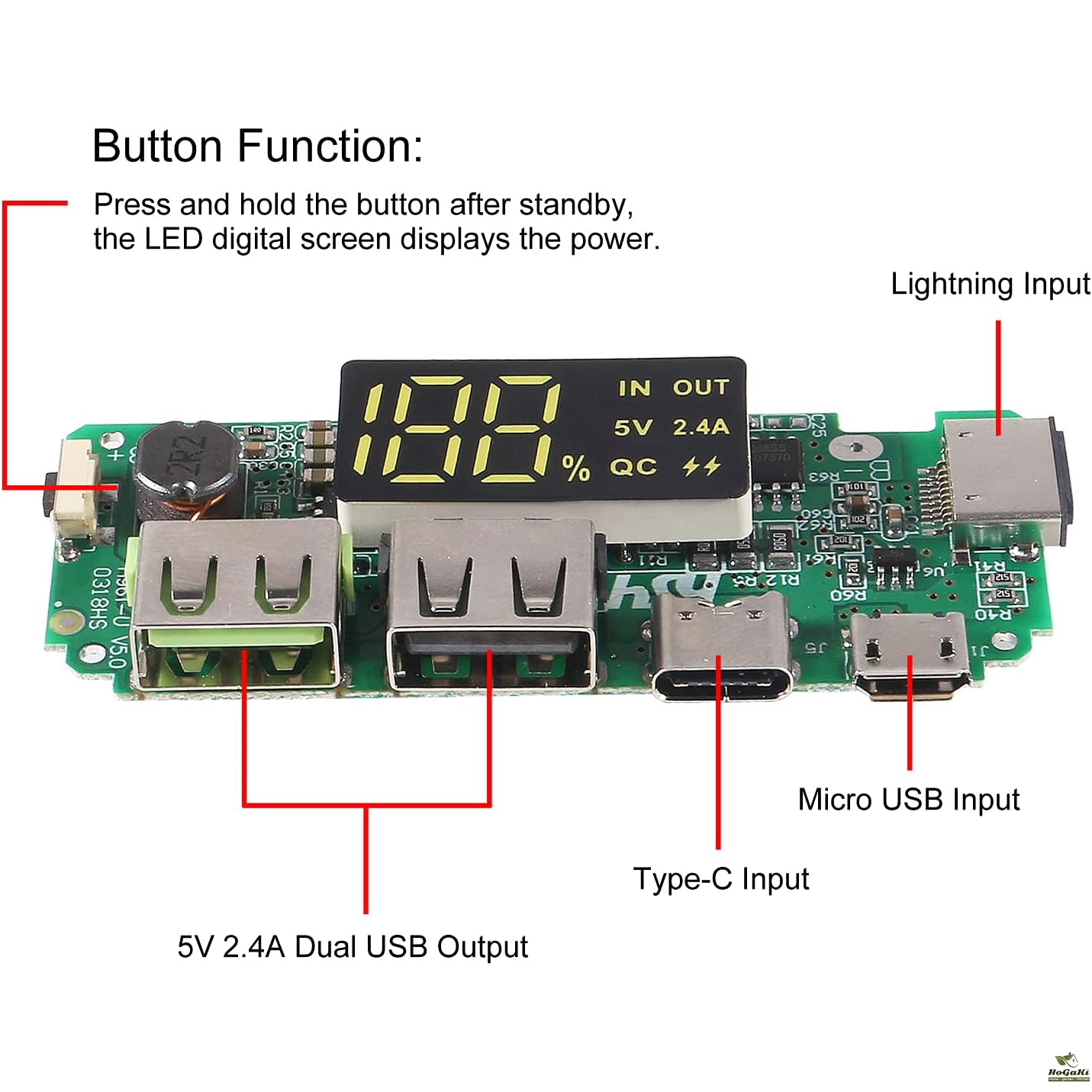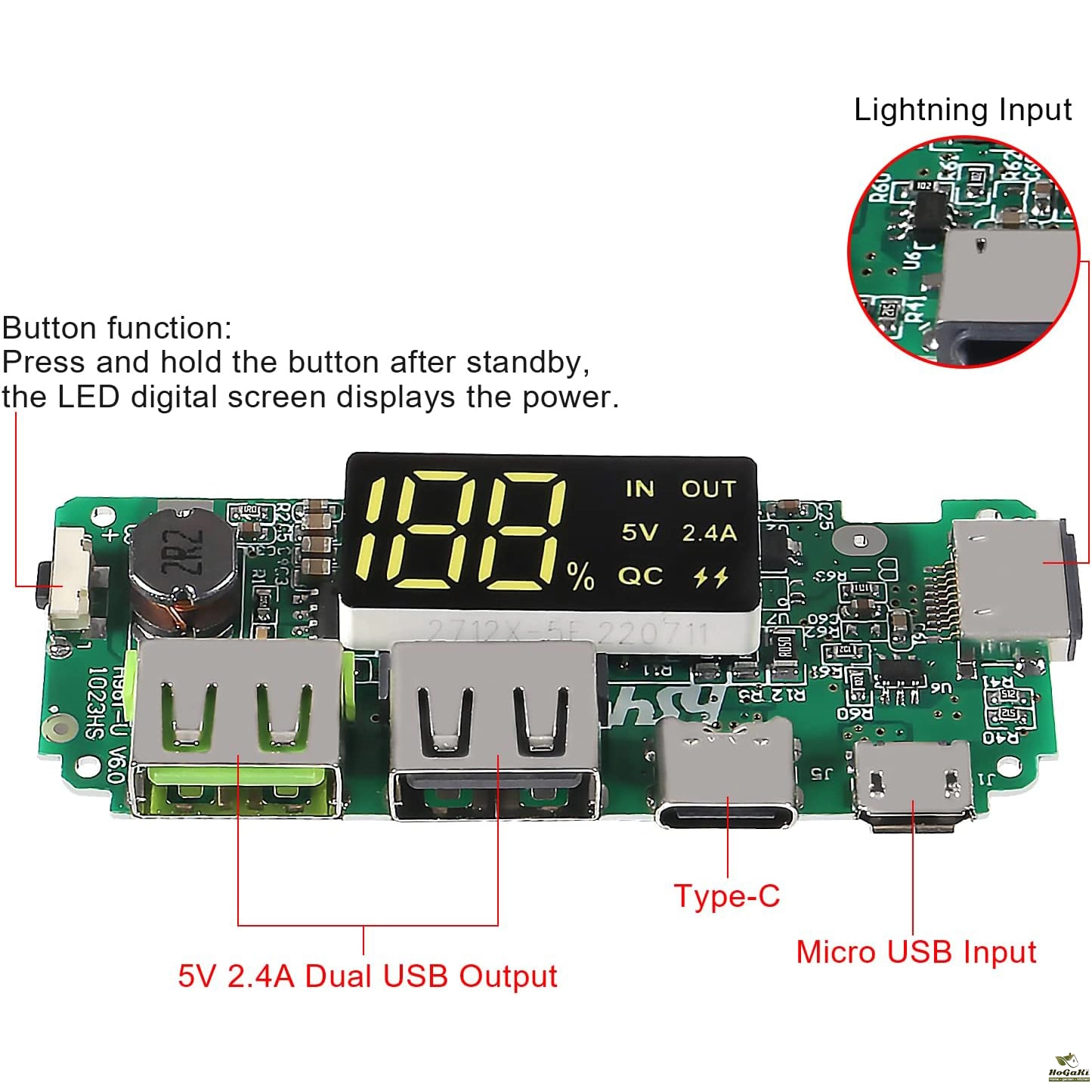 • Dual USB 5V 2.4A :Equipped with dual USB 5V 2.4A ports, it provides versatile charging options for your mobile power bank or 18650 charging module circuit.