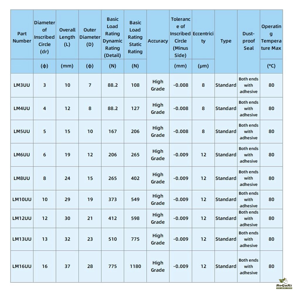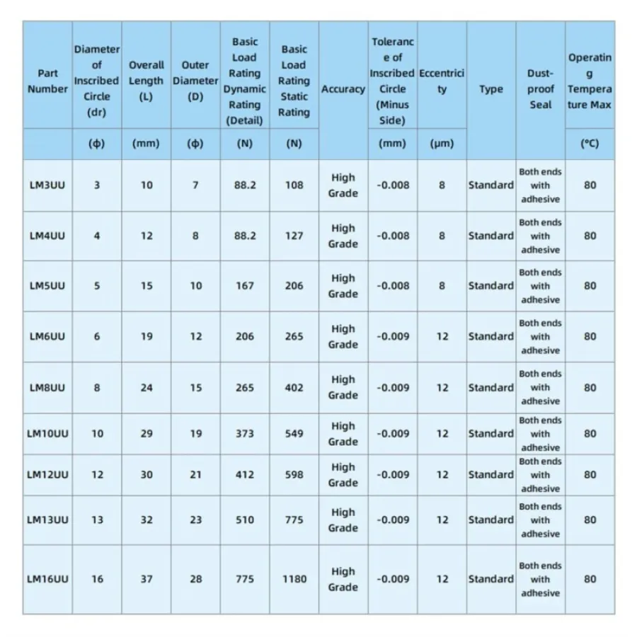 [SIZE] - Model: LM3UU 3x7x10 LM4UU 4x8x12 LM5UU 5x10x15 LM6UU 6x12x19 LM8UU 8x15x24 LM10UU 10x19x29 LM12UU 12x21x30 LM16UU 16x28x37 LM20UU 20x32x42 LM6LUU 6x12x35 LM8LUU 8x15x45 LM10LUU 10x19x55 LM12LUU 12x21x57 LM13LUU 13x23x61 LM5LUU 5x10x29 LM8SUU 8x15x17 LM13UU 13x23x32