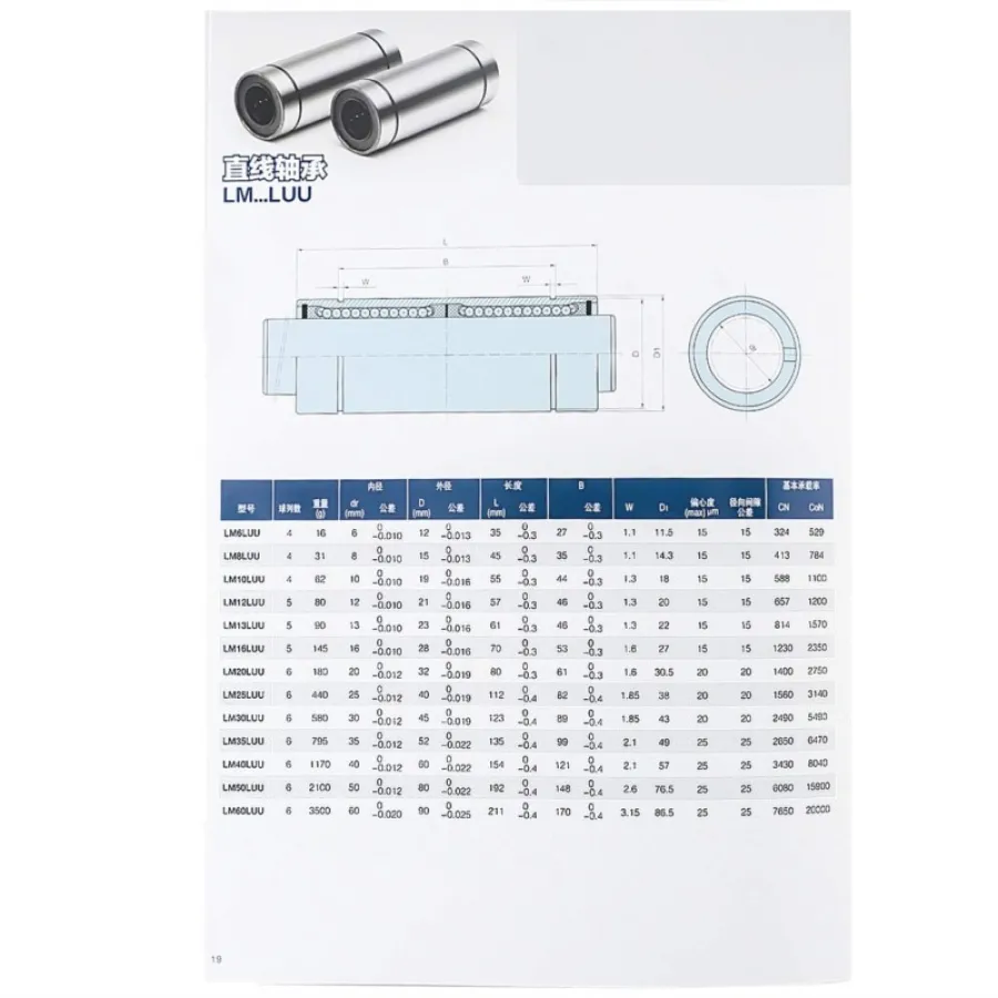 [SIZE] - Model: LM3UU 3x7x10 LM4UU 4x8x12 LM5UU 5x10x15 LM6UU 6x12x19 LM8UU 8x15x24 LM10UU 10x19x29 LM12UU 12x21x30 LM16UU 16x28x37 LM20UU 20x32x42 LM6LUU 6x12x35 LM8LUU 8x15x45 LM10LUU 10x19x55 LM12LUU 12x21x57 LM13LUU 13x23x61 LM5LUU 5x10x29 LM8SUU 8x15x17 LM13UU 13x23x32