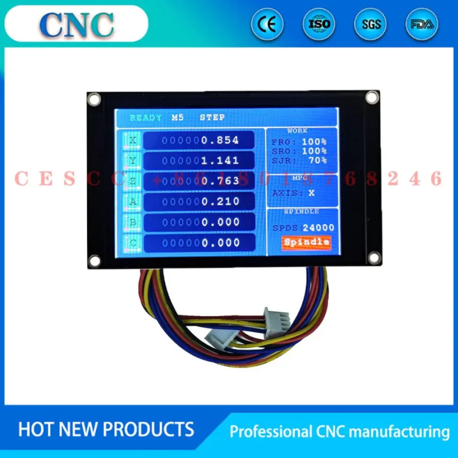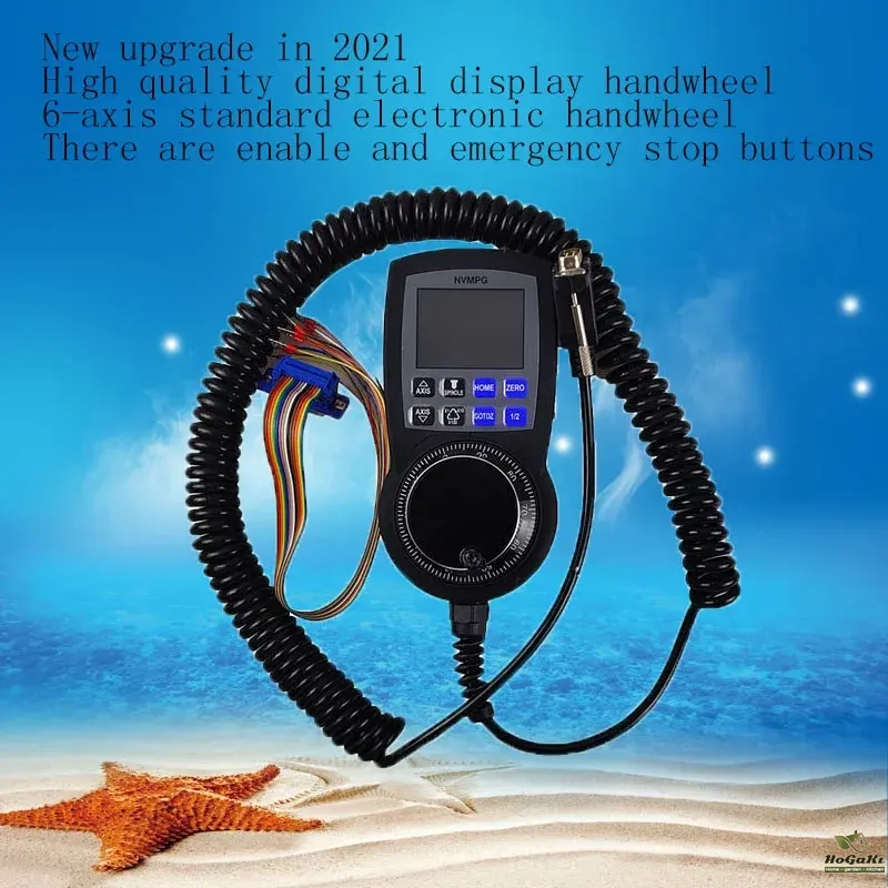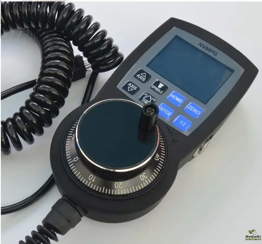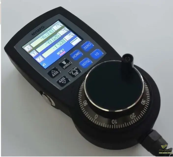 This MPG has a screen and 10 buttons. Coordinates and other parameters are displayed on the screen. The user can change the axis and speed through buttons.
