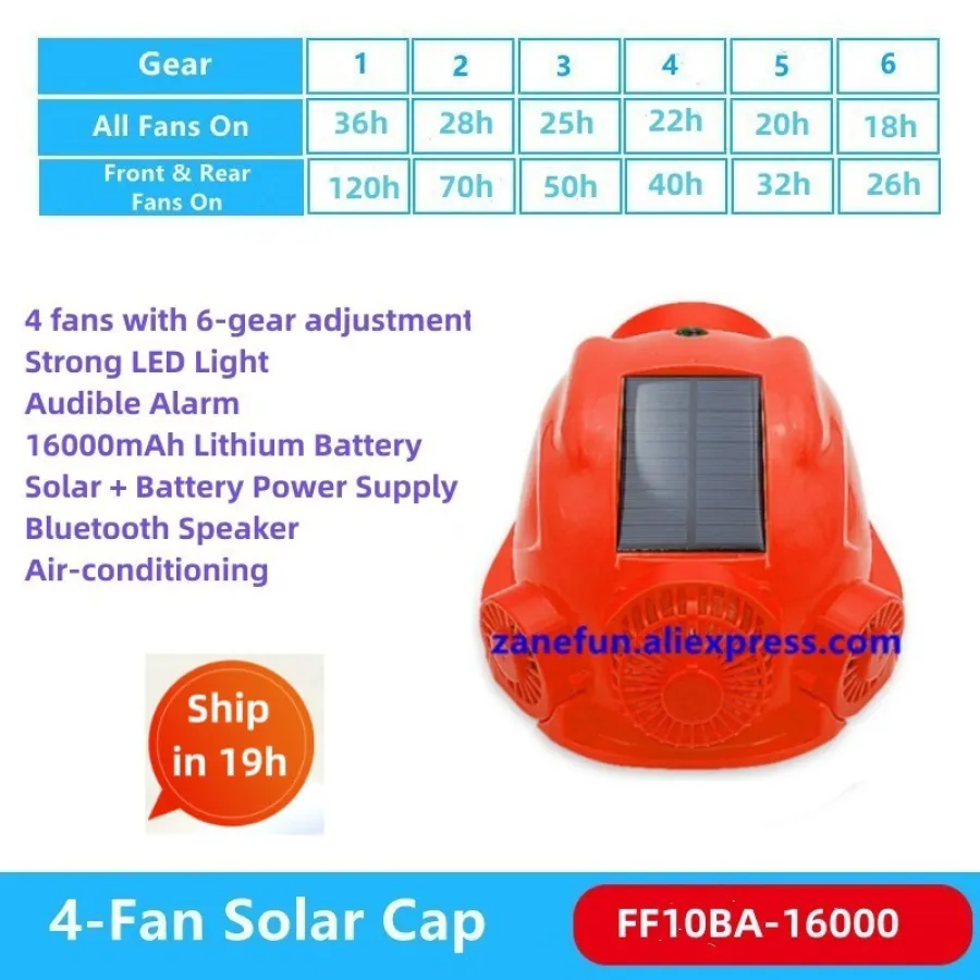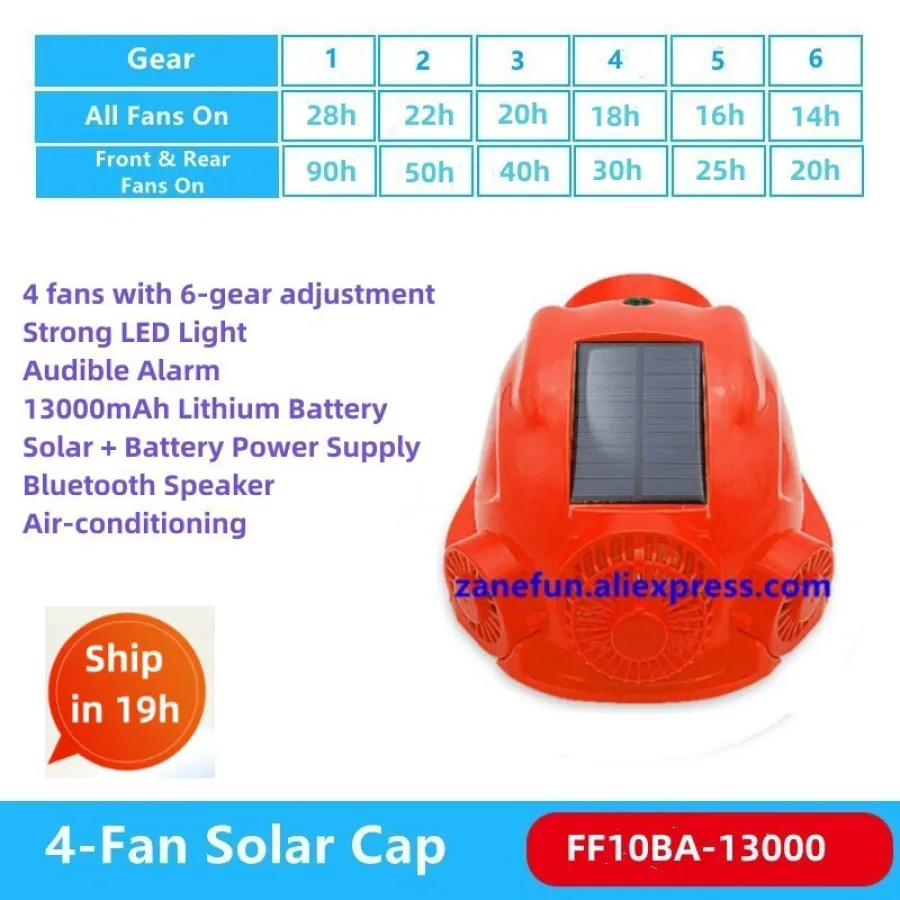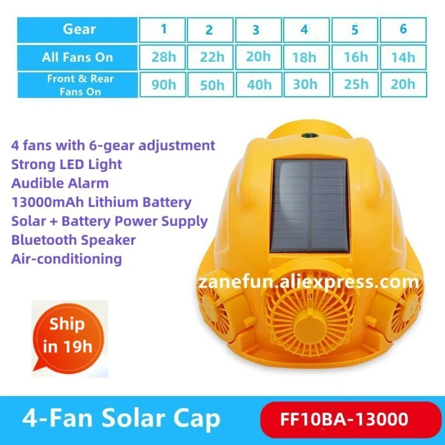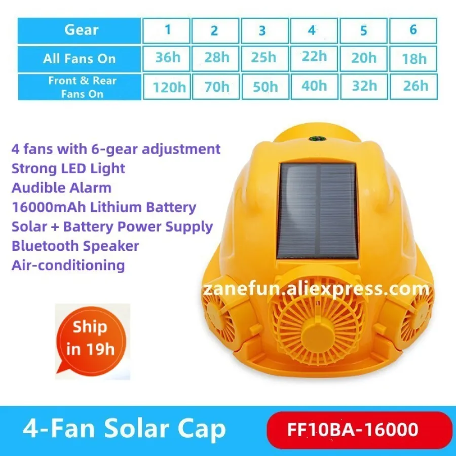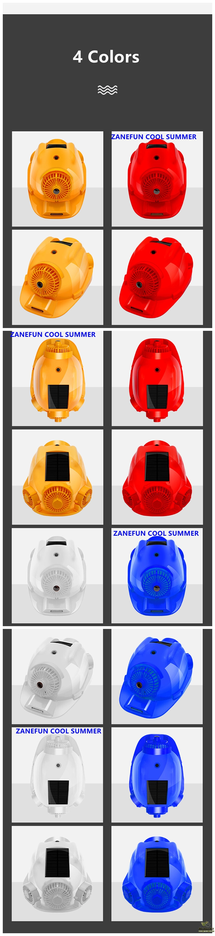 Certified ABS Helmet with 4 Fans, Nano Spray Air Conditioning, Bluetooth, FM Radio, LED Headlight, 9000mAh/12000mAH/16000mAh/20000mAh Rechargeable Lithium Battery(Power Bank), Audible SOS Alarm, and 1 Big Solar Panel