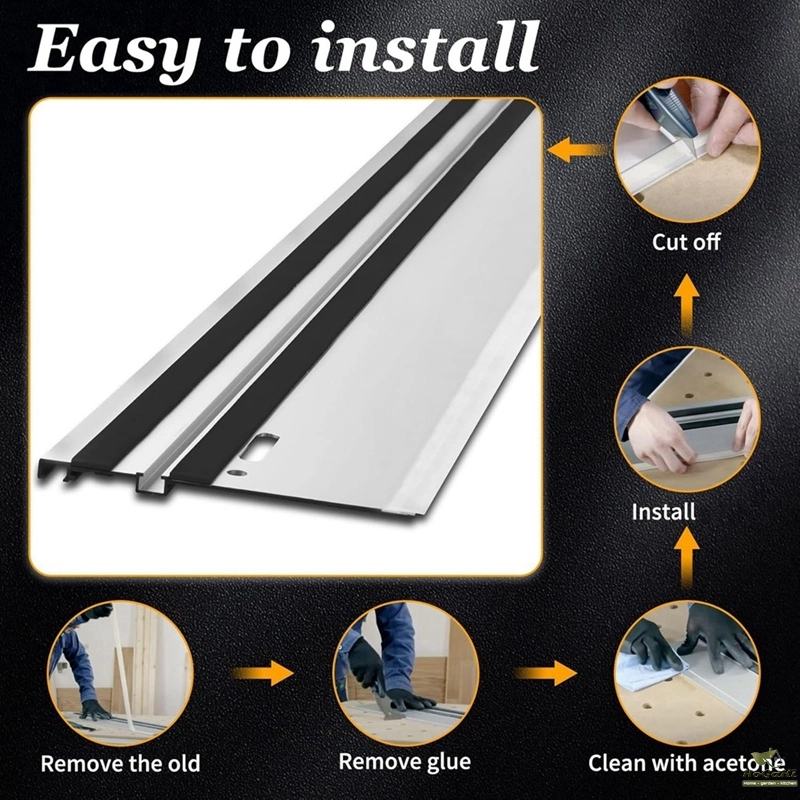 Easy to replace: As the splinter guard is cut into upon the first use, it reflects the exact cutting edge, meaning that it can be applied exactly at the scribe mark. You just need to remove the tape to use it. It's very simple. NOTE: You need to clean the rail with acetone and leaving surface grease free prior fitting the new splinter guard.