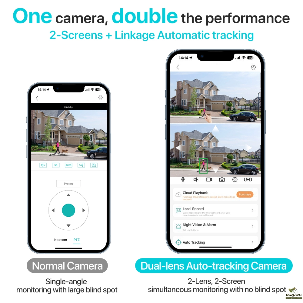 - Two video screens in the APP. The first screen is PTZ camera, and the second screen is fixed position camera.![]()