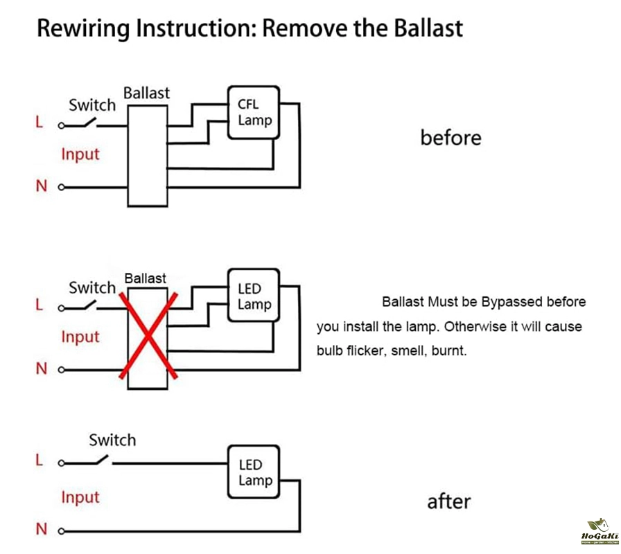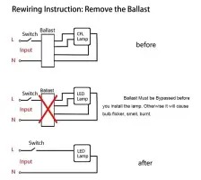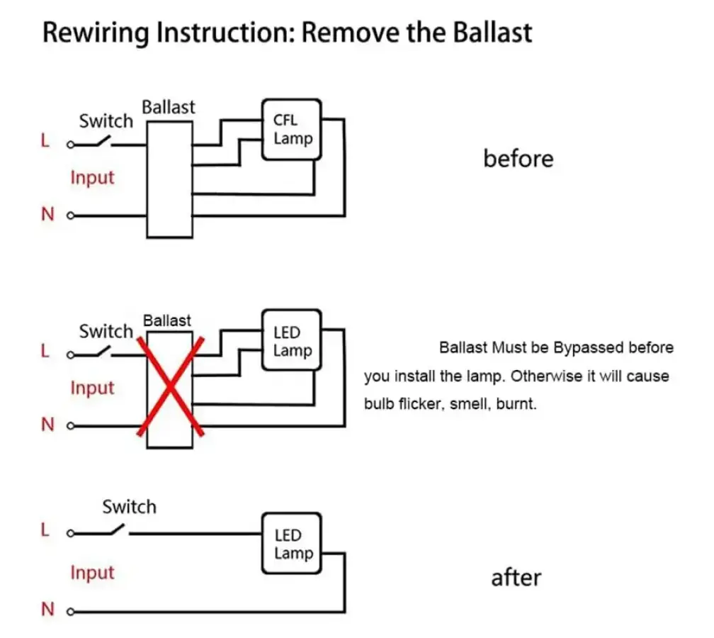 3). Normally, the Ballast has a black and white wire on the input side (AC input side, 100V -120V for North America). It also has two red and two blue output wires. To bypass this ballast, please cut all the Input and output wires, so total 6 wires cut.