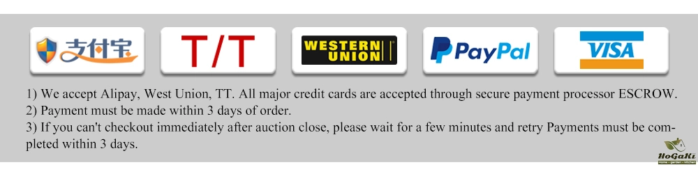 1) We accept Alipay, West Union, TT. All major credit cards are accepted through secure payment processor ESCROW.