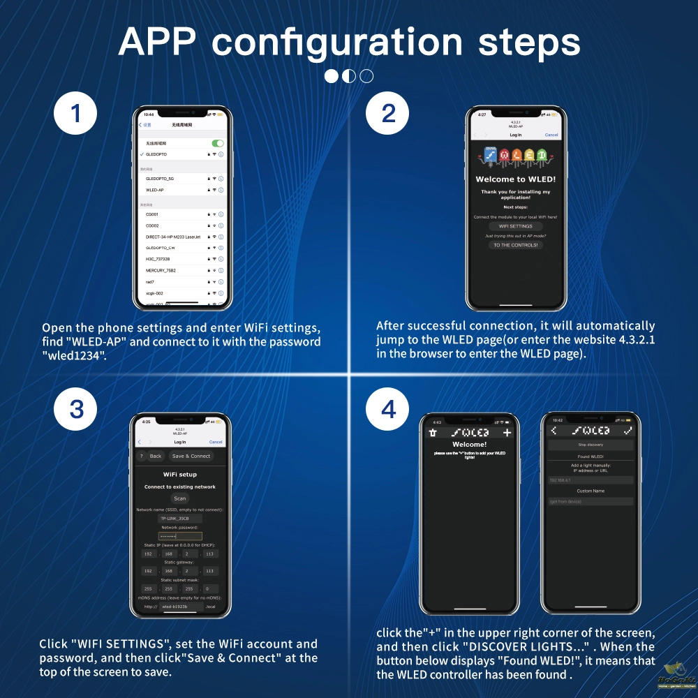 Wireless control and no need for a gateway: Through the dedicated wled app, users can directly control the lights on their smartphones without additional gateway devices, simplifying the installation and usage process.