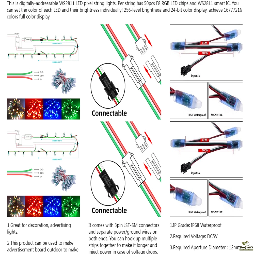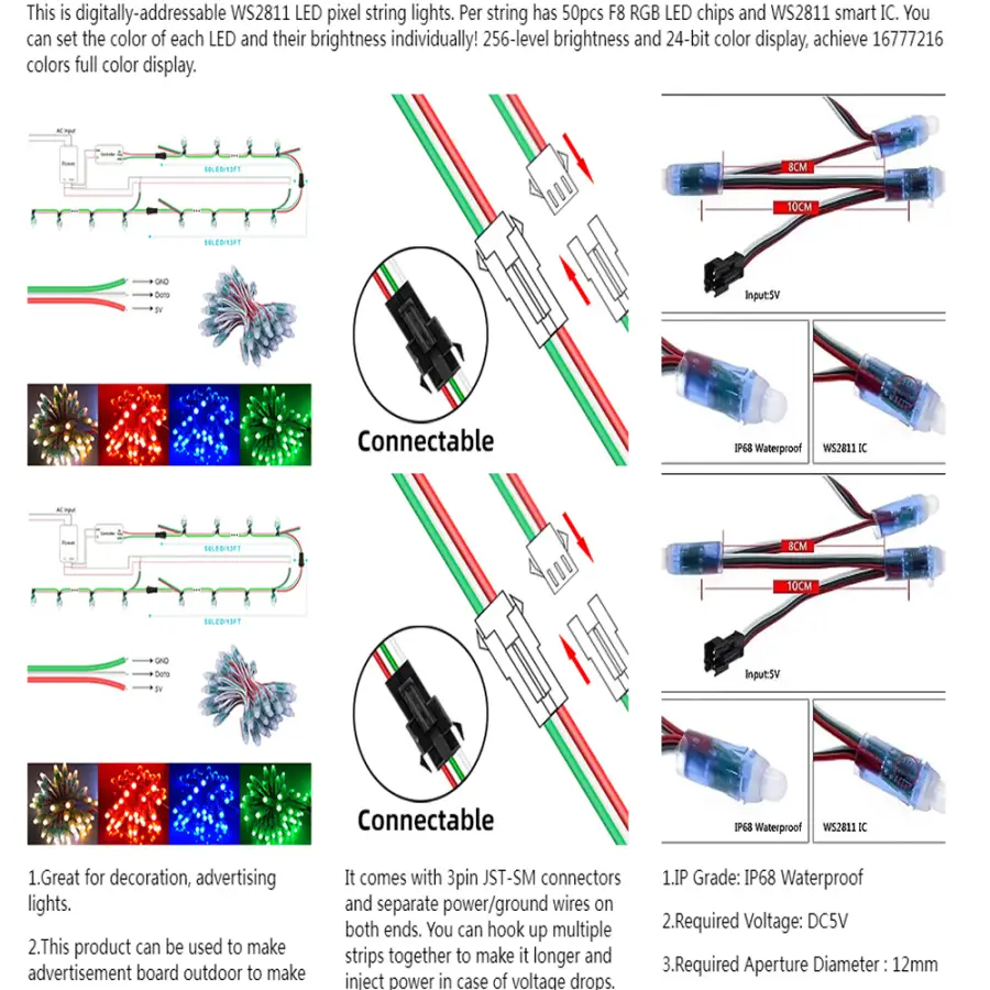 1, working voltage: DC5V 12V;2. LED working current: 18-20mA.3, waterproof LED light color: full colorThird, waterproof LED light string use:The use of waterproof LED light string to do outdoor luminous characters, outdoor signboards is to highlight the brand and fashion, greatly enhance the size and grade of the business. Mainly used for: star hotel outdoor signboard, hotel roof signboard, hotel exterior signboard, hotel door signboard, hotel exterior wall signboard, exterior wall LED perforation, KTV signboard, sauna bath center signboard, hotel signboard, store signboard, door Head signboard, digital square signboard, property building signboard, shopping mall signboard, etc.Fourth, the method of making exposed LED letters:1, LED outdoor sign making tools: 40W or 60W electric soldering iron, solder, electric drill, glue gun, screwdriver, etc.2, LED outdoor signboard production requires other materials: molding paint iron word (preferably purchased locally to reduce transportation costs), wire (I can provide), LED signage power supply (DC5V, I can provide).3. Drilling: Fix the purchased shaped iron word to the appropriate position and drill with electric drill (9mm or 12mm). The spacing is determined according to the height of the outdoor card installation and the production cost. The general LED center spacing is: 10 - 30mm, the pitch is small, the brightness is high, and the cost is higher.4, plug in the light: clean the drilled holes, put the lights one by one.5. Connection: There are waterproof LED light strings that have been made and connected. Each string has a reserved wire end. Generally, the red is connected to the positive pole of the power supply. The black wire is connected to the negative pole of the LED dedicated power supply. The power supply is best placed. In a waterproof power box.6. Test aging: After all the LEDs are connected, the inspection process is not bright, and then the aging test is carried out for 48 hours.7. Transport to the site and install on the site with scaffolding.Five, use precautions1. The voltage of each string of outdoor waterproof LED is DC 5V, and the current is about 40 mA.2. Please use a power supply with a output voltage of 5 VDC.3, waterproof LED power calculation: For example, the output voltage is 5V50A power supply can install the number of LED lights: 30 * 0.8 / 0.16 = 1500 LED lights, that is, about 75 strings of waterproof LED (20 a string), recommended 1000 One LED uses one power supply. If you want to use more than one power supply, do not have a loop between the power supplies, otherwise it will burn the power!4. The cross-sectional area of the wire drawn from the power supply should not be less than 4 mm 2 (or 2 2.5).5. The red line of the light string is connected to the positive pole of the power supply (some are 2, and then connected to the positive pole of the power supply).6. The black wire of the light string is connected to the negative pole of the power supply (some are 2, and then connected to the negative pole of the power supply).7. If it is found that the individual lights are not bright, please squeeze the LED lights and the seat hard. If it is not bright, please replace the LED lights. 8, two-color and colorful LED full-color waterproof exposed light string is a common positive, the controller controls the negative. 9. The four-line red light of the full-color LED exposed waterproof light string is positive, in order: positive, negative, data, clock, using our own developed LED driver chip: CXB107! Its supporting CXB107 controller is also our company Self-developed, can control 2000 points. Its performance exceeds LPD6803 and supporting controllers!