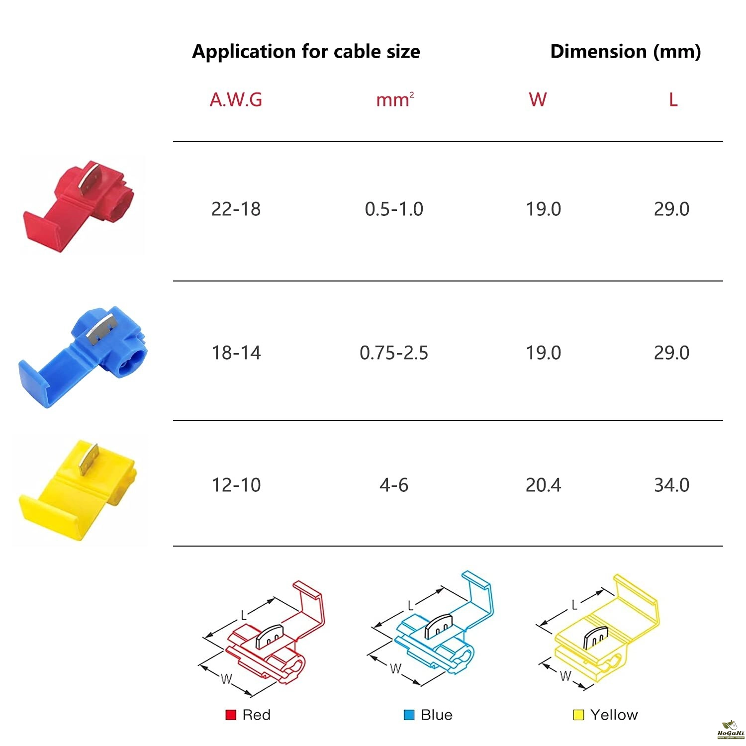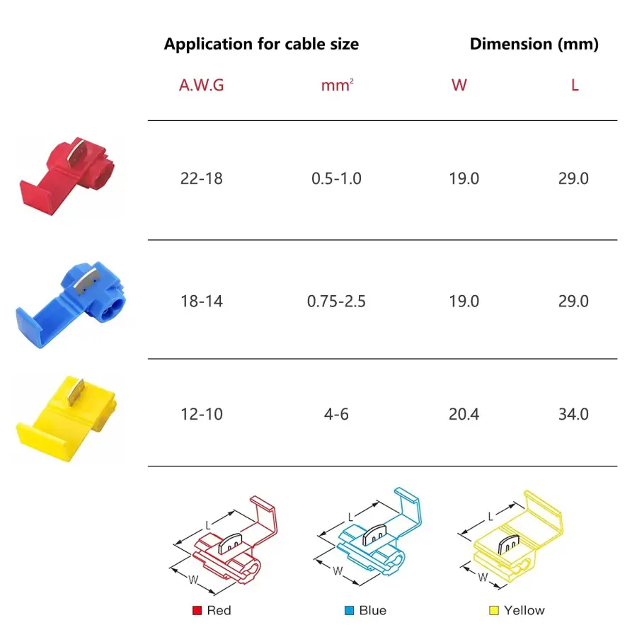 [ PACKAGE INCLUDED ] - The Solderless Quick Splice Wire Connectors kit includes 22-18AWG/Red 50PCS/18-14AWG/Blue 50PCS/12-10AWG/Yellow 50PCS