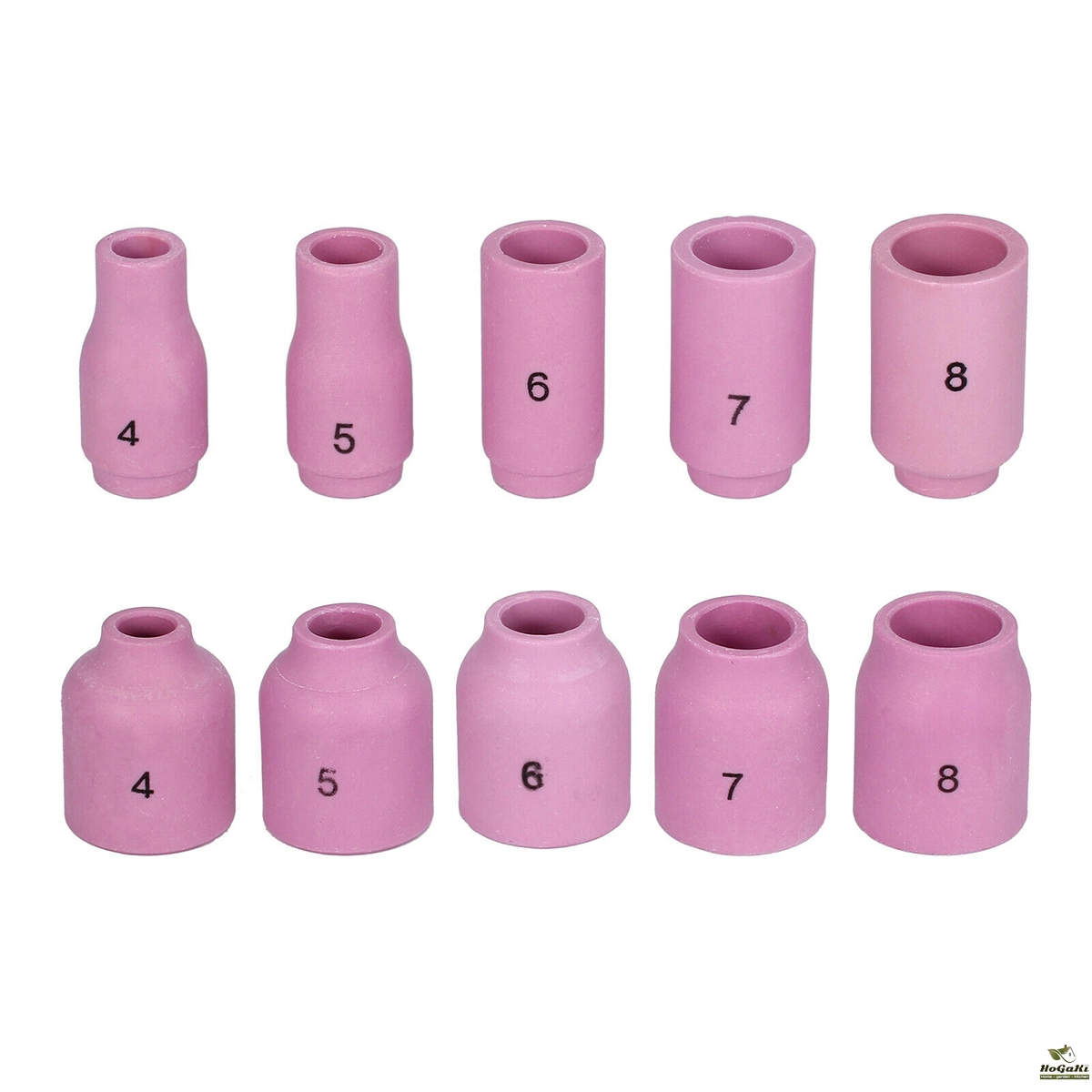 4. 【Package Content】You will get 6pcs glass cups + 10pcs TIG alumina nozzles + 4pcs TIG stubby gas lens + 4pcs TIG gas lens collet bodies + 8pcs TIG collets + 3pcs TIG back cups + 18pcs temperature resistant O-rings + 2pcs cup gaskets.