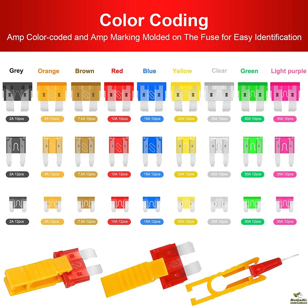 It contains a variety of mini and standard fuses with blade contacts and a plastic case, color-coded by amperage to prevent the installation of mismatched fuses.