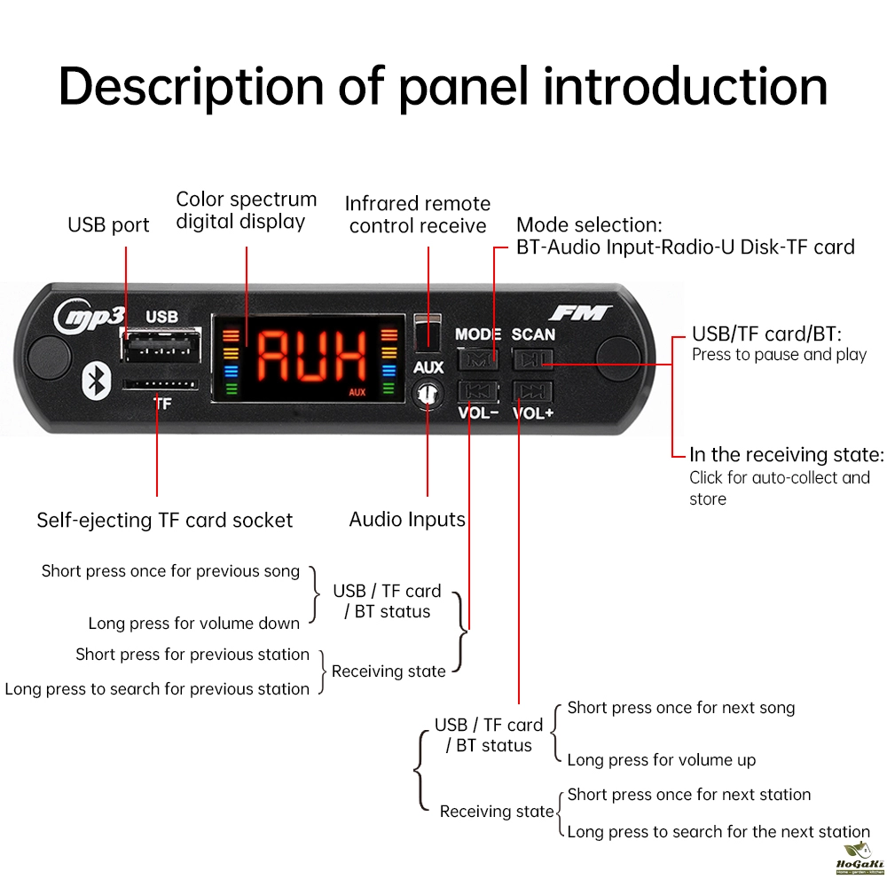 2. AUTO button (play/pause): Press AUTO briefly in MP3 mode to play/pause; Short press in FM mode for automatic collection and coexistence of stations, long press without function; Short press to play/pause in BT function.