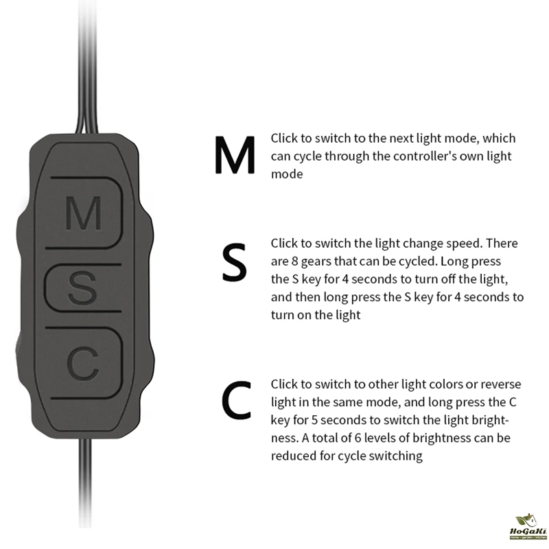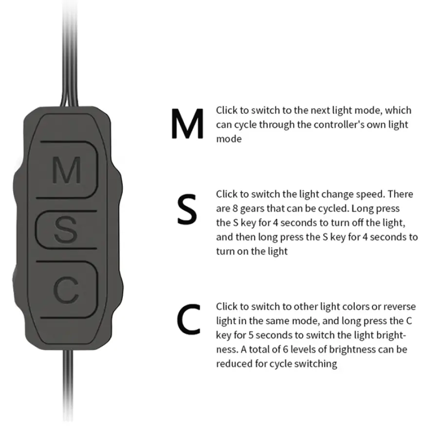 C:Click to switch to other light colors or reverse light in the same mode, and long press the C key for 5 seconds to switch the light bright-ness. A total of 6 levels of brightness can be reduced for cycle switching