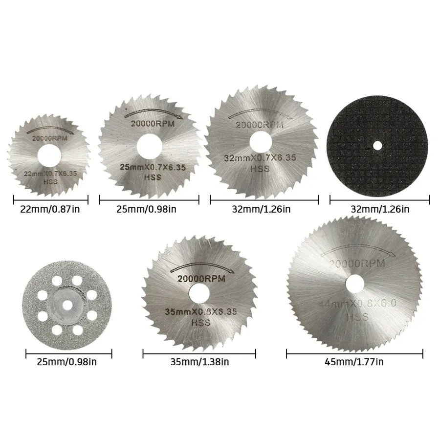 545 diamond cutting disc with hold can help better heat dissipation, increase the service life. HSS mini saw blades is made of high speed steel with great heat resistance. Resin cutting wheels is for cutting wheel, can work at high temperatures.