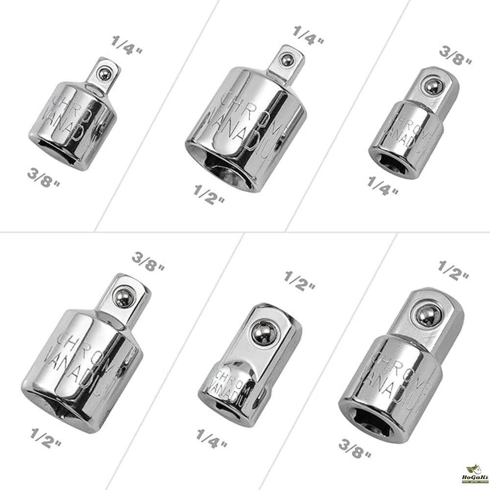 6 Piece set includes:3/8" to 1/4" drive reducer,3/8" to 1/2" drive adapter,1/2" to 3/8" drive reducer, 1/2" to 1/4" drive reducer, 1/4" to 3/8" drive adapter, 1/4" to 1/2" drive adapter.