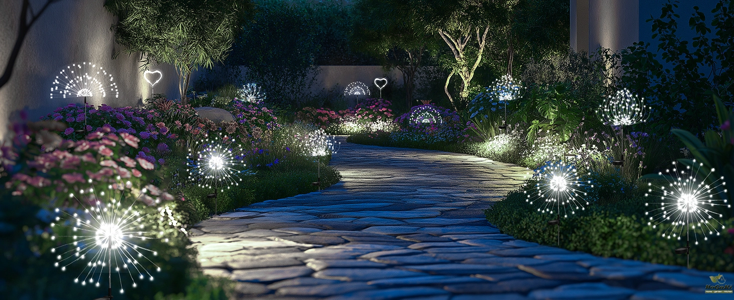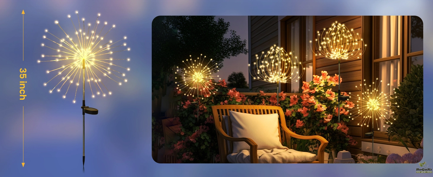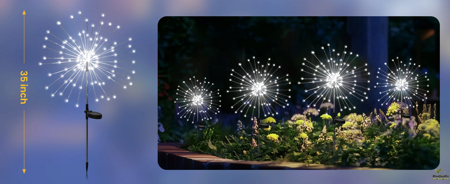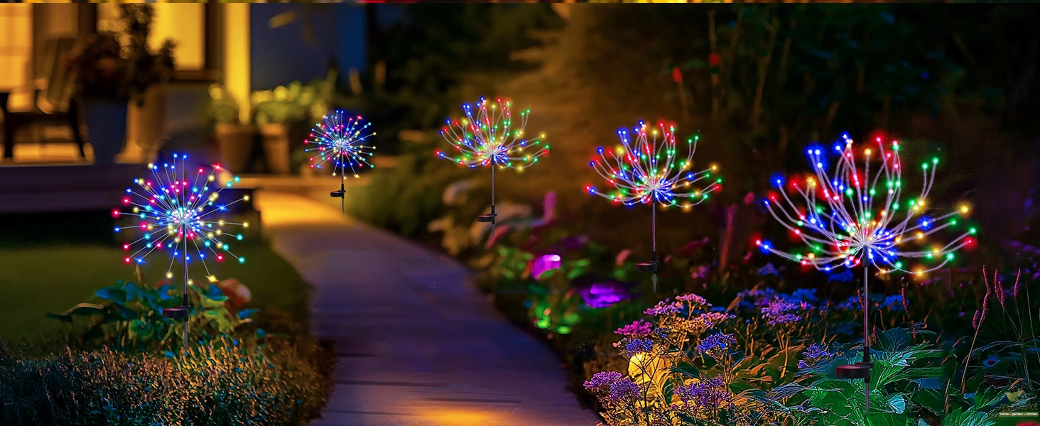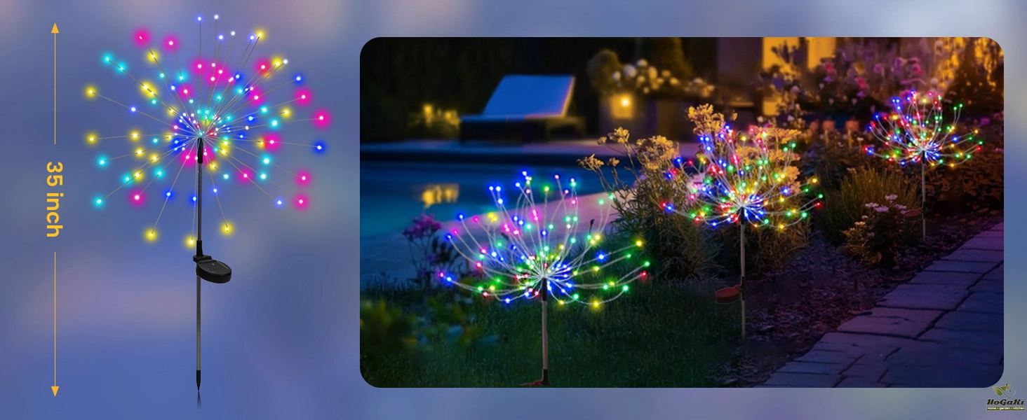 Colorful Display, Festival Atmosphere Maker:Featuring solar garden decor lights transmitted through fiber optics, outdoor solar lights create a mesmerizing fireworks effect. Perfect for setting the mood for holidays like Halloween, Christmas