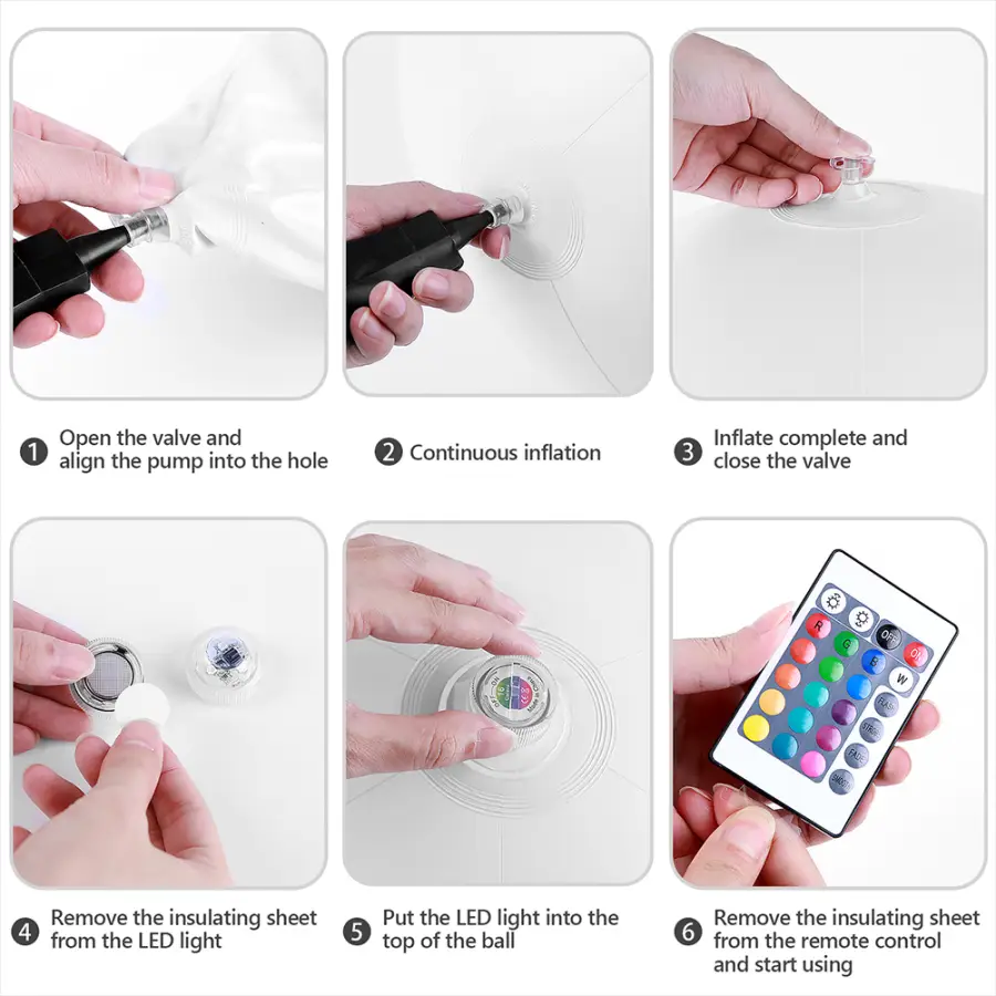 Feature: Specification: Origin: Mainland China Material: PVC Shape Style: Round Occasion: party,Birthday Party Size: 60cm: 60cm before inflation, 40cm after inflation/15.74inch 90cm: 90cm before inflation, 60cm after inflation/23.62inch Material: 0.18mm PVC Packaging: EVA bag packaging, beach ball + light + remote control Remote control light: 16-color inflatable luminous ball-ultra-bright LED lamp beads, red, yellow, blue, green, pink, purple and white can flash quickly and slowly, monochrome, always on, timing and other functions 16 kinds of light colors + 4 kinds of flashing methods + brightness adjustment (monochrome, gradient, flashing), IP68 waterproof design, 24-key infrared remote control Power supply: 2 CR2032 batteries, working time is about 20 hours