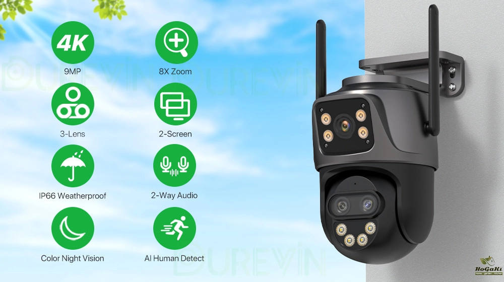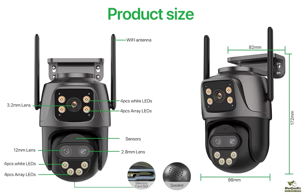 3-lens, 2-screen, Notifications alarm, humanoid tracking, two way voice intercom 360 monitoring, full color night vision, IP66 waterproof, mobile phone remote monitoring,Share video, SD card storage, 24 hours video recording![]()