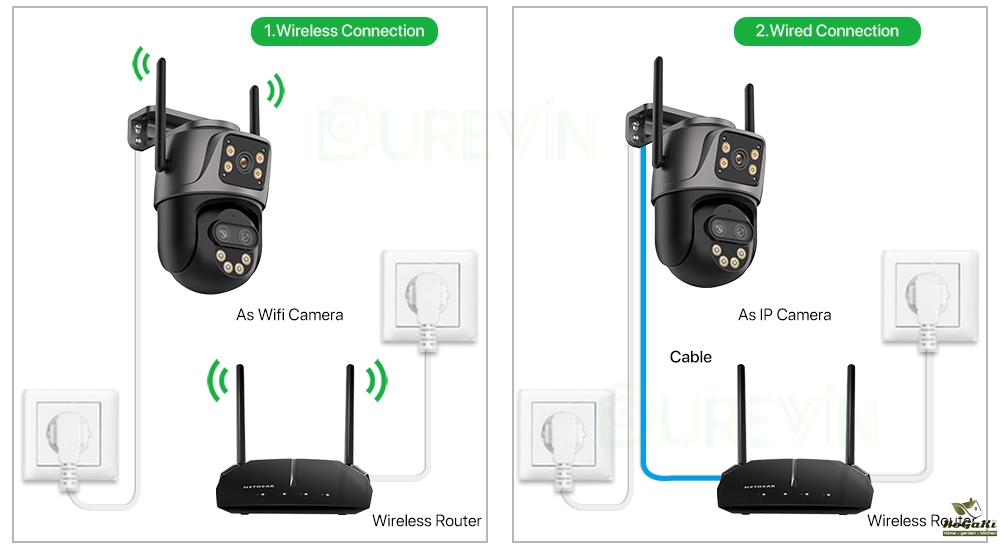 Powered by DC 12V adapter, you can connect the camera to Wi-Fi network. you can setup wifi connection of the camera or LAN Search with network cable connected to router, work with 2.4G wifi only (Does not support 5G).![]()