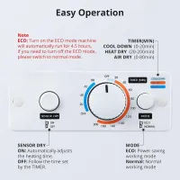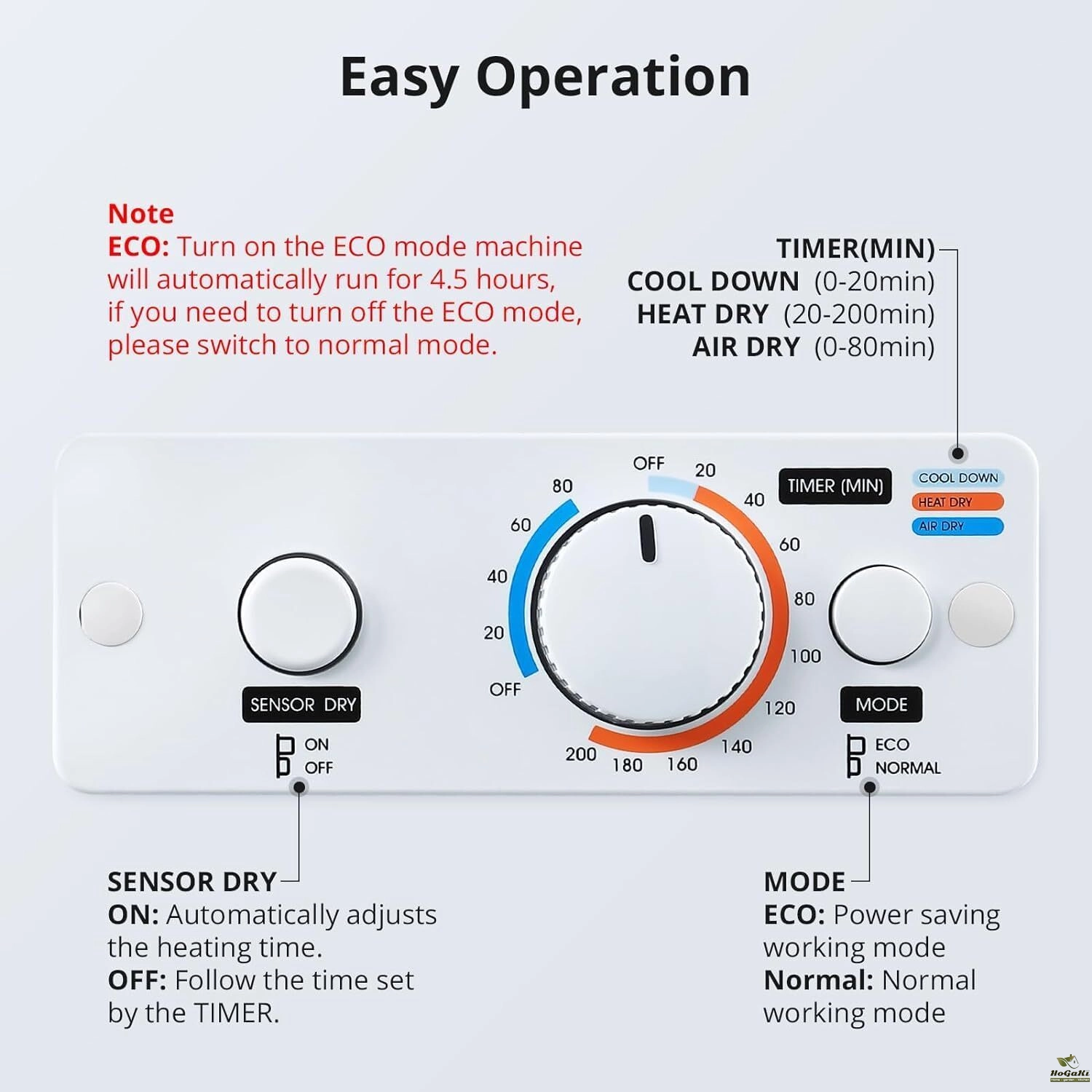 EASY TOUCH KNOB: This dryer offers ECO, NORMAL, and Sensor Dry modes. The user-friendly button design allows for easy adjustment based on the color bar (COOL DOWN, HEAT DRY, AIR DRY). This allows for quick and efficient drying while preventing clothes from wrinkling, resulting in comfortable and fluffy garments. The ECO mode is energy-saving, alleviating concerns about electricity bills, while the NORMAL mode is our recommended option for fast clothes drying.