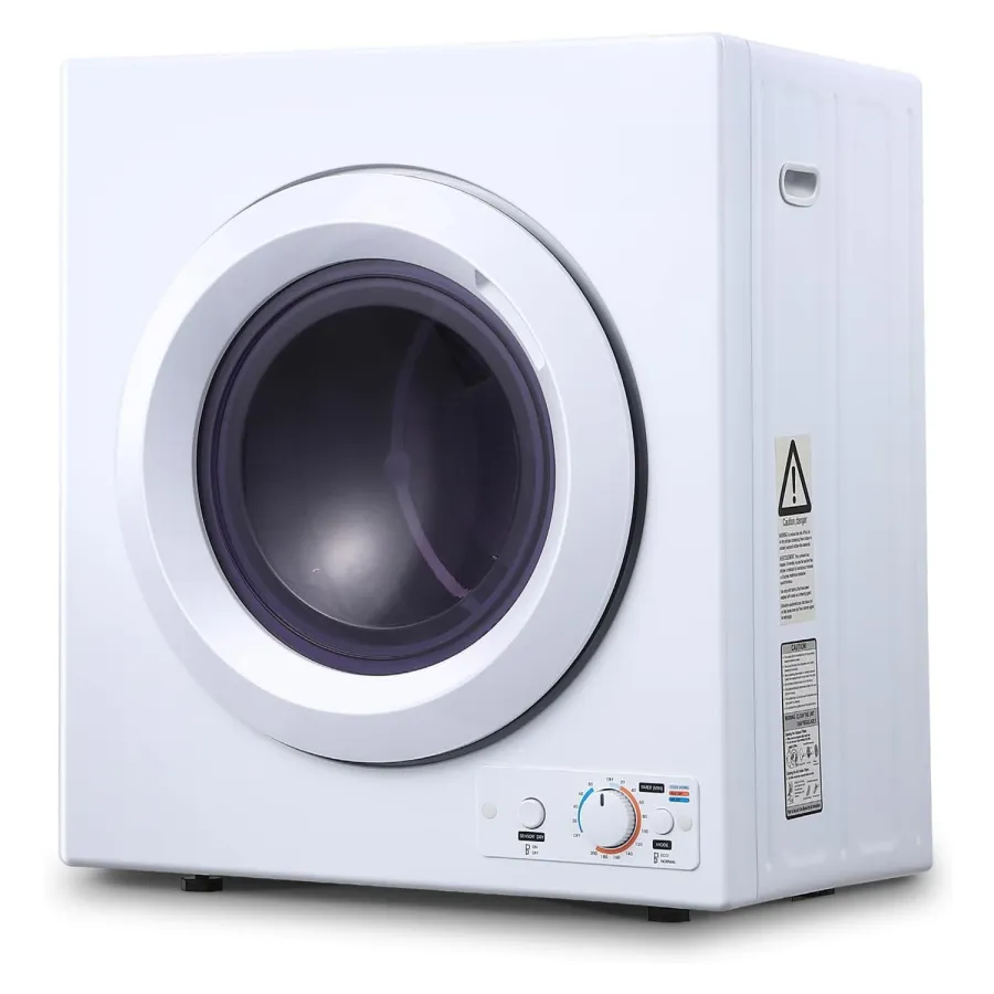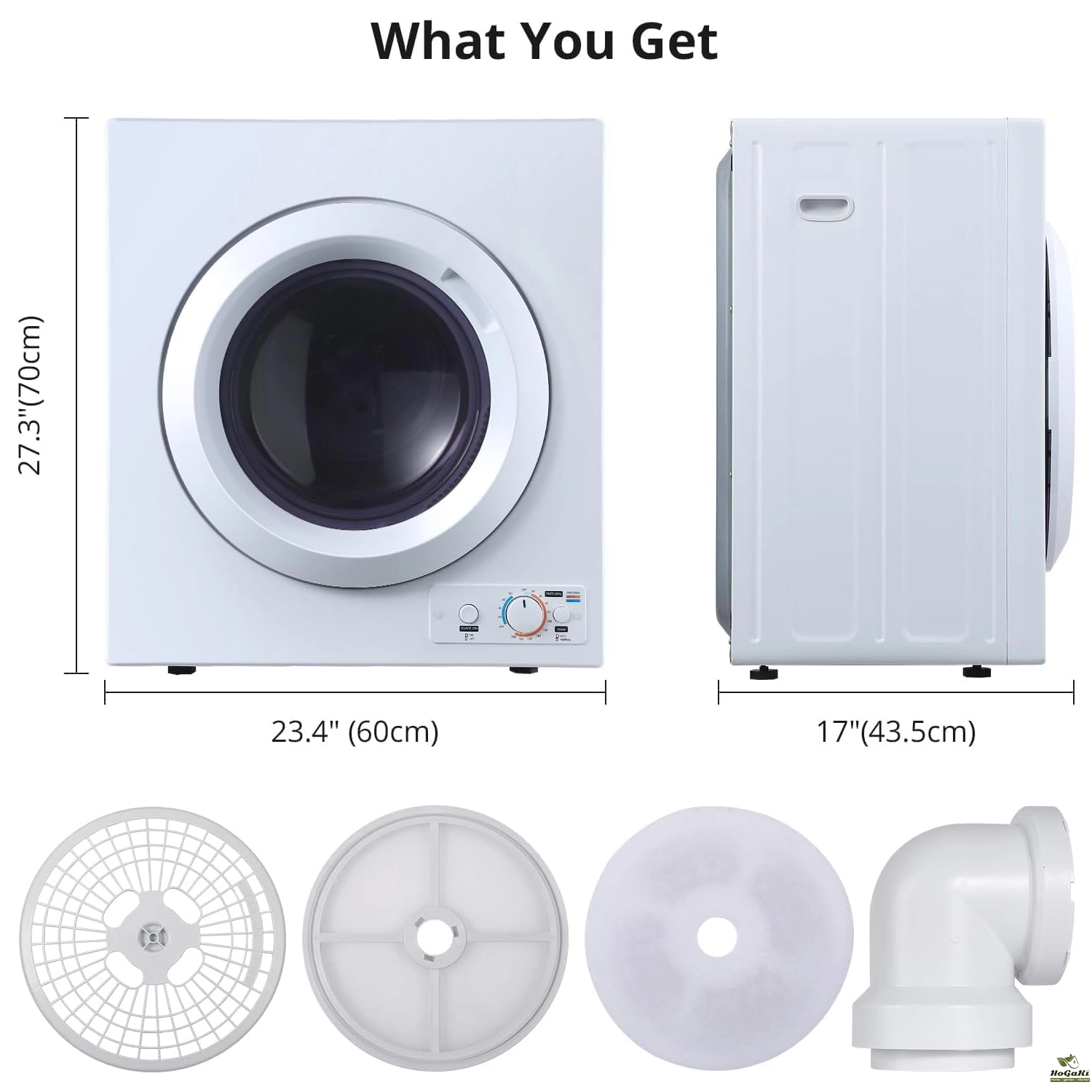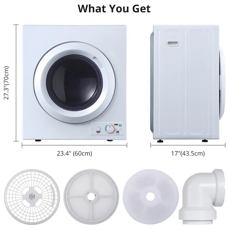 COMPACT & PORTABLE FRONT-LOAD CLOTHES DRYER: With a net weight of 54.9 lbs, this clothes dryer is designed to be easily portable. Its small size, measuring 23.6 x 22.2 x 27.5 inches (L x W x H), makes it ideal for tight spaces such as apartments, dormitories, RVs, and more. It can even be wall-mounted for efficient space-saving.