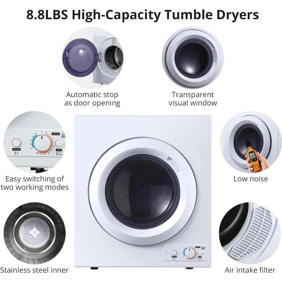UPDATED STAINLESS STEEL DESIGN: This dryer boasts a durable stainless steel drum and an internally engineered structure. Its full rotation mode ensures fast and even drying. The multiple filtration system effectively removes lint and hair and is easy to clean. Anti-wrinkle feature leaves your clothes smooth and fresh after drying. Note: giving the dryer a 1-hour rest after extended use promotes longevity.