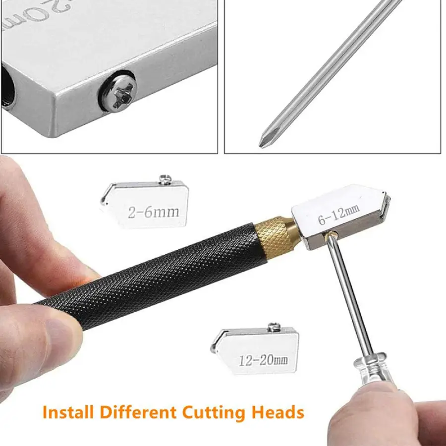 【LARGER CUTTING RANGE】 3 pieces of cutting heads with different sizes in our package, 2-6mm, 6-12mm and 12-20mm, Easy to change the cutting blade for cutting different glass thickness.