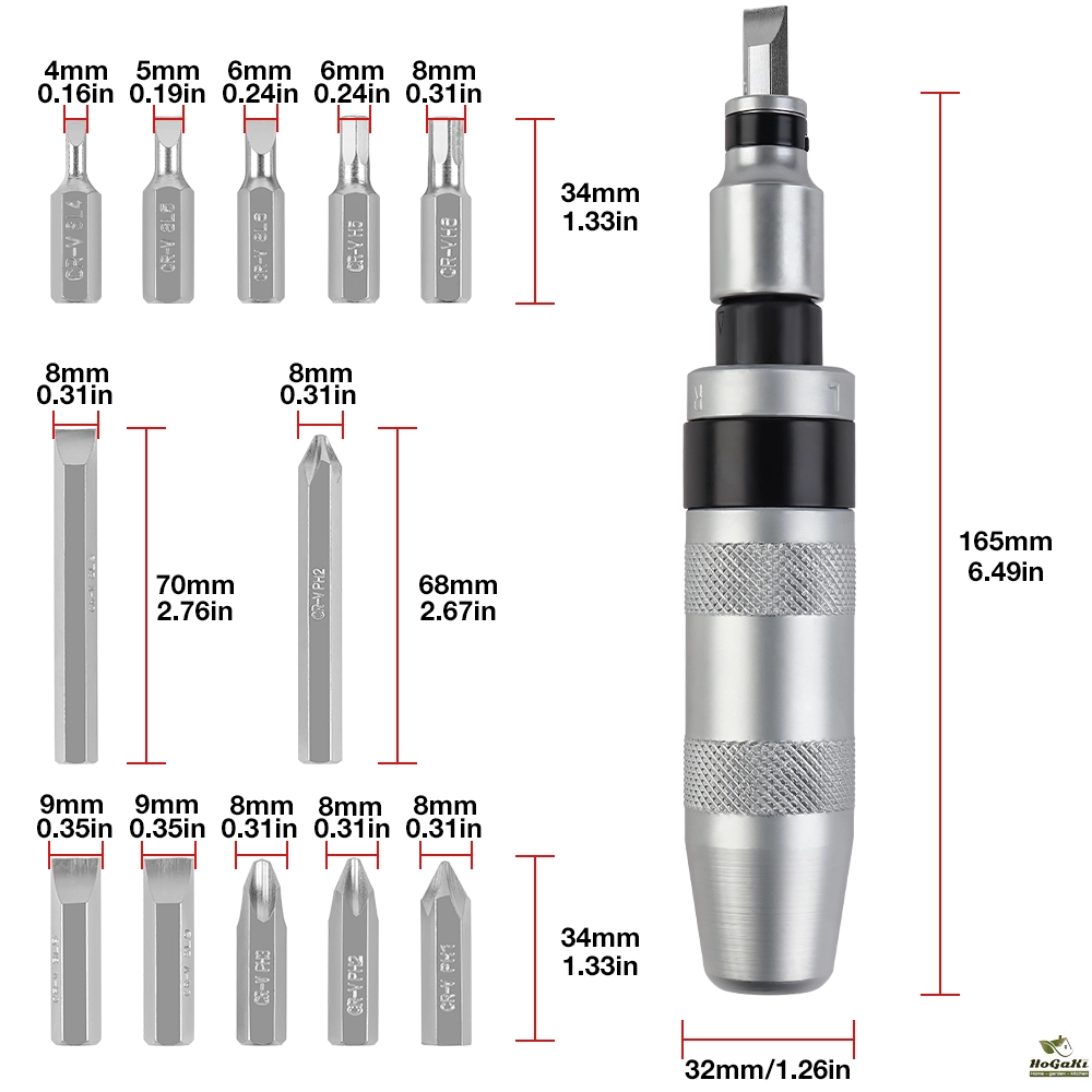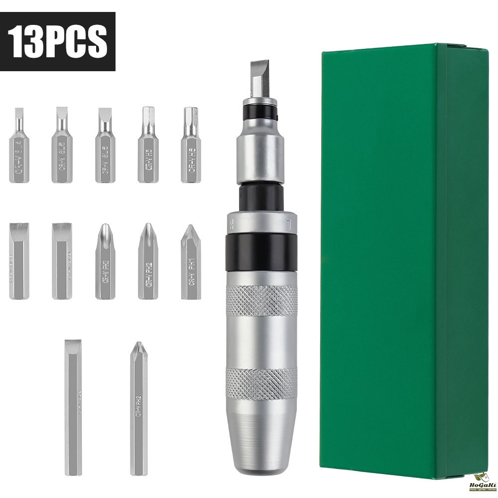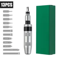 13Pcs:4Pcs Phillips Bits - PH1, PH2*2, PH3; 6Pcs Slotted Bits - SL4, SL5, SL6, SL9*3; 4Pcs Hexagonal Bits - H5, H612Pcs: 3Pcs Phillips Bits - PH2*1, PH2*2, PH3*1;4Pcs Slotted Bits - 10mm Slotted*1, 10mm Slotted*1, 8mm Slotted*1, 8mm Slotted*1; 2Pcs Decapitation extractor - 4#*1, 3#*1.