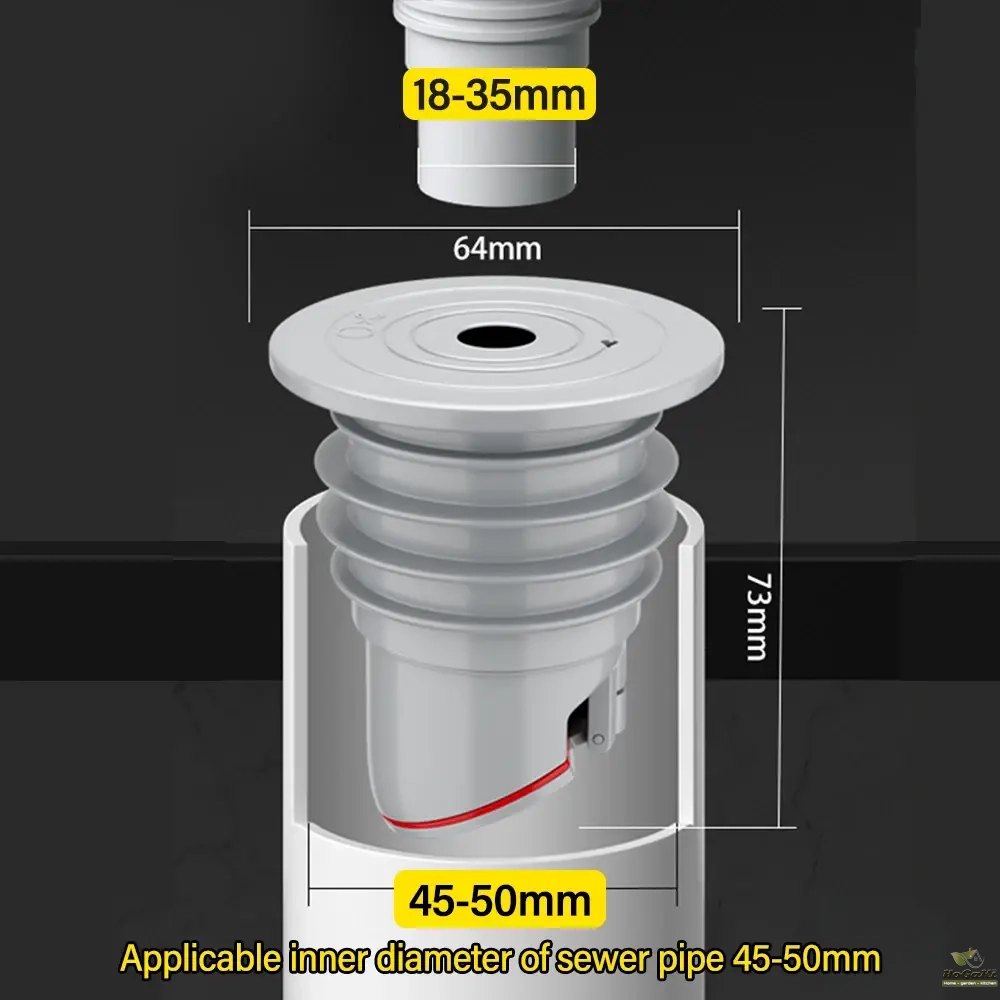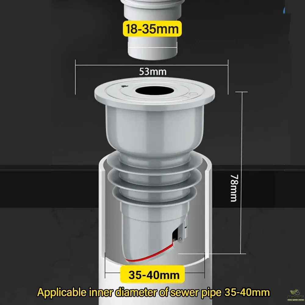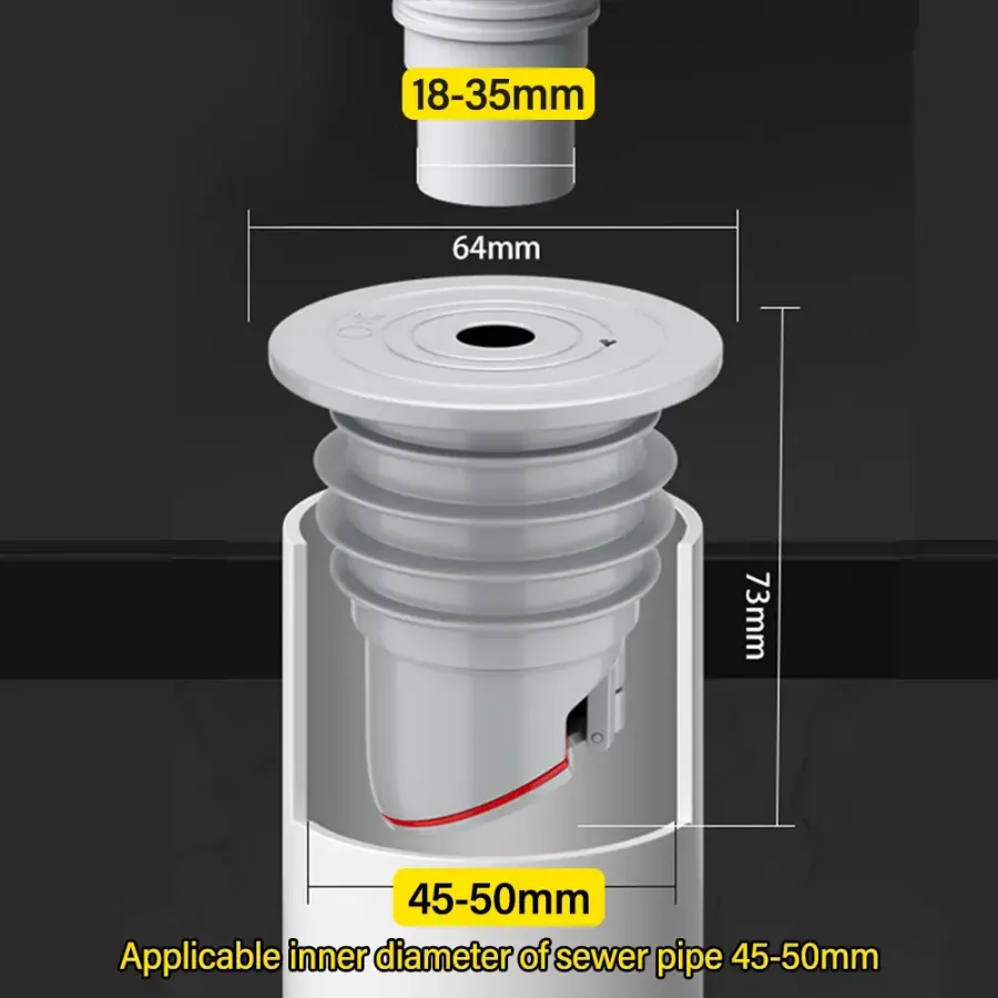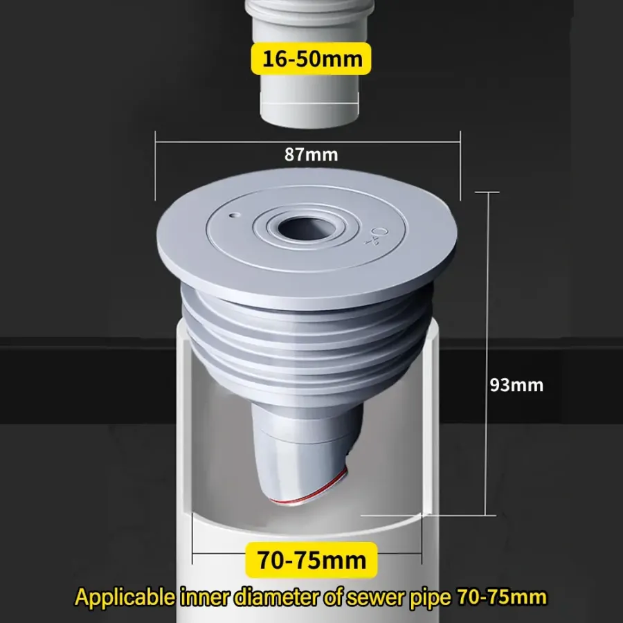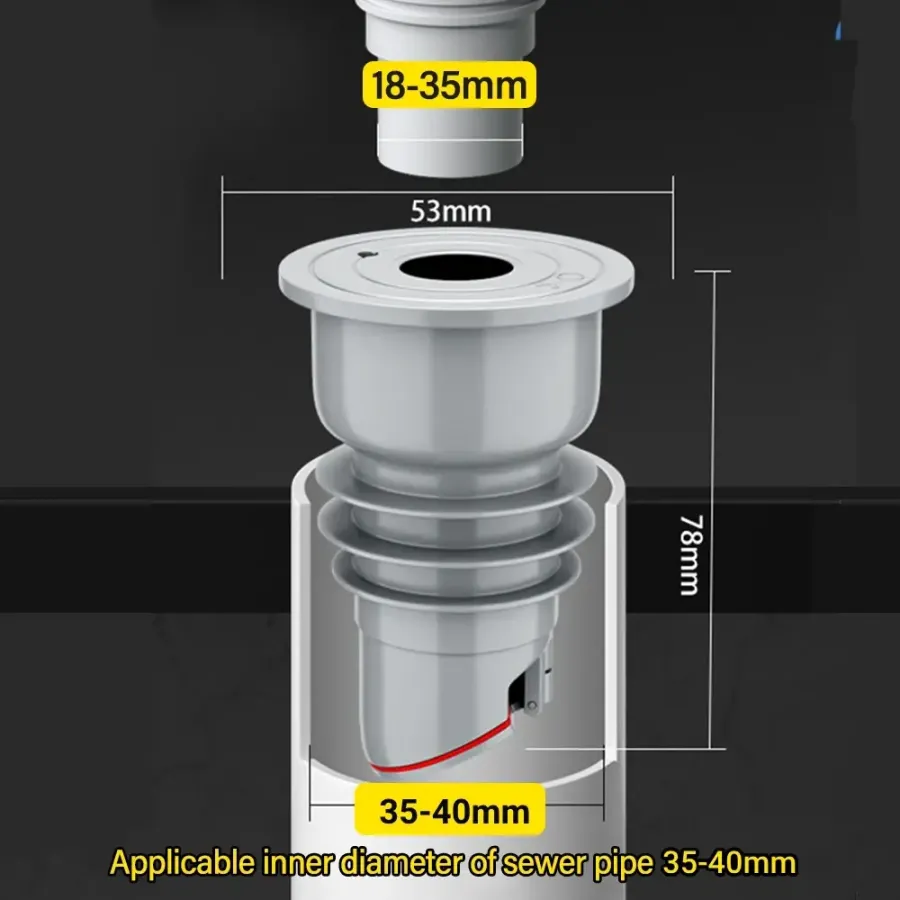 The bathroom pipe plug has a variable diameter design, which can connect to the outer diameter of 16-50MM drain pipes and is suitable for the inner diameter of sewer pipes 35-40 and 45-50 and 70-75.