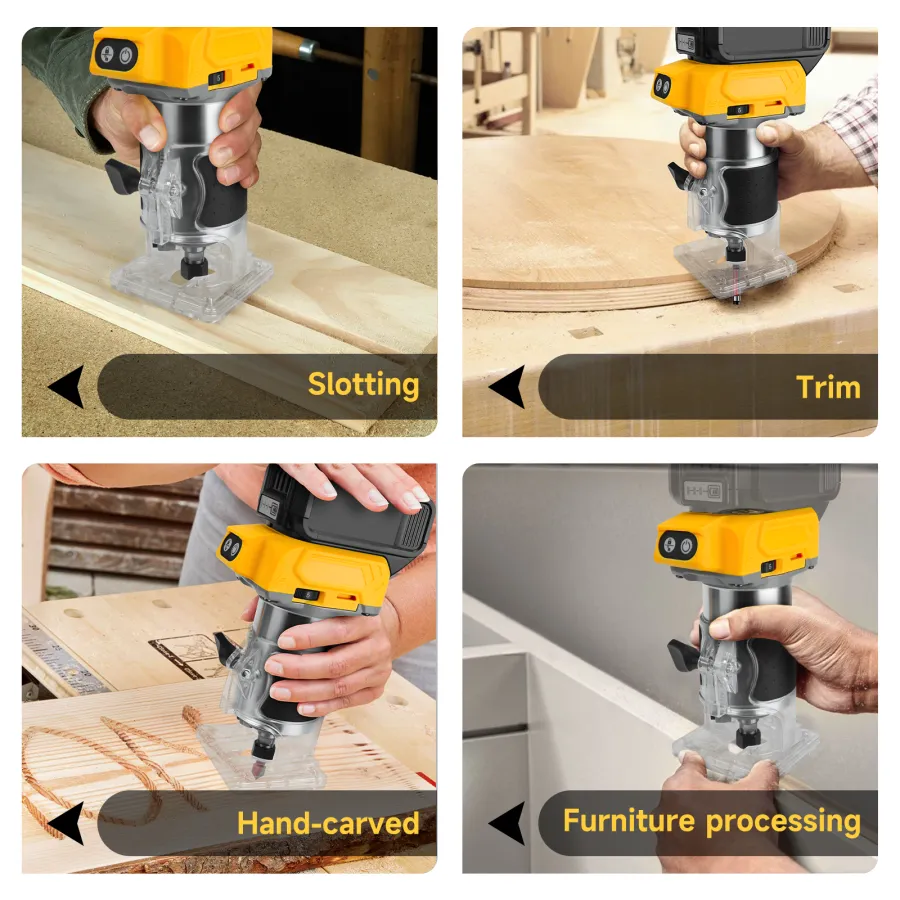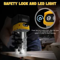 【5-Speed Variable Control】---The RexLeLXB wireless wood trimming machine has 5 adjustable speed settings, ranging from 3000r/min to 30000r/min, allowing you to easily customize the speed of the wood router to match different materials and tasks. Whether you are grinding edges, slotting, or carving, the speed lock function ensures consistent and precise cutting every time, giving you full control and flexibility for all your woodworking projects.