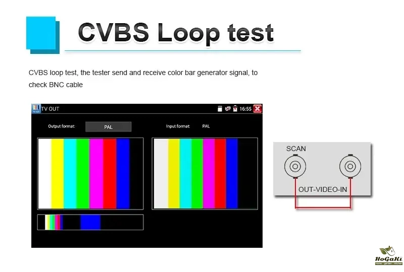 ● CVBS loop test, the tester can send and receive color bar generator signal, to check BNC cable
