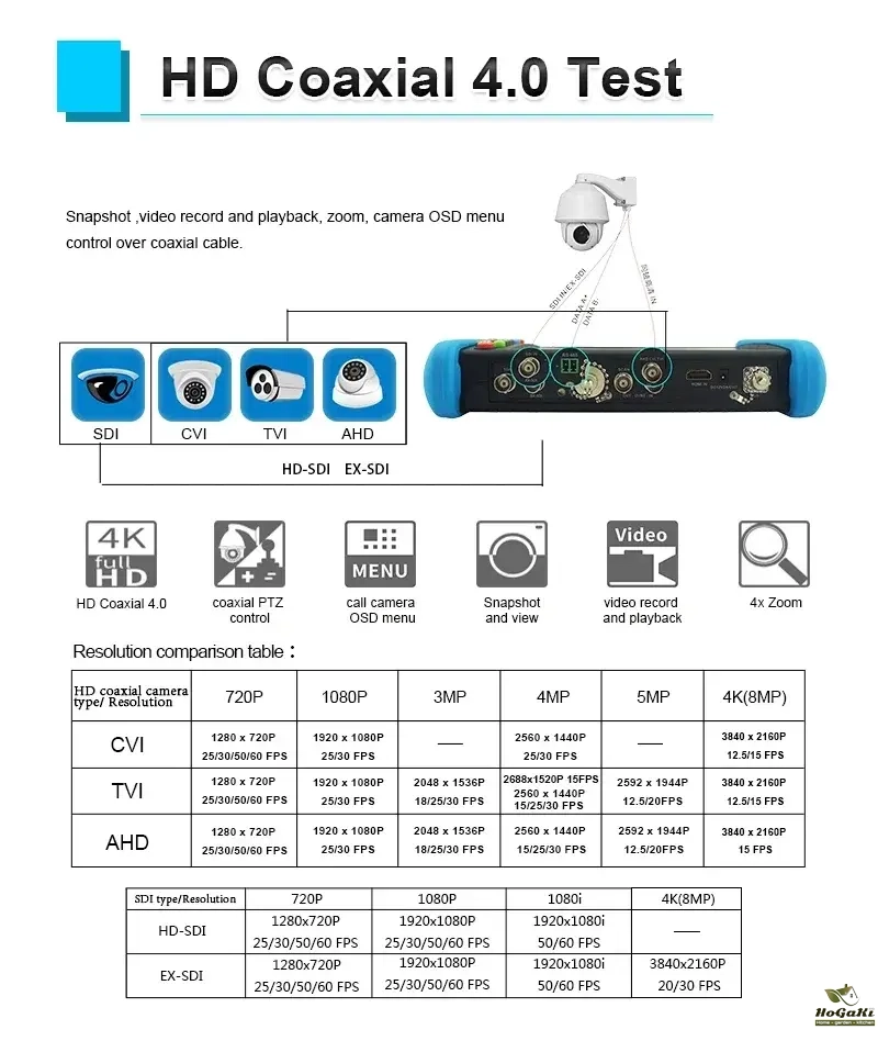 ● 8MP CVI test, 3840 x 2160P 12.5/15 FPS, 4xzoom, video record & playback, coaxial PTZ & call OSD menu *