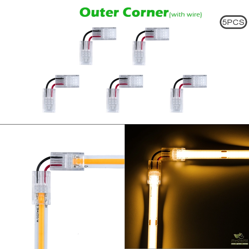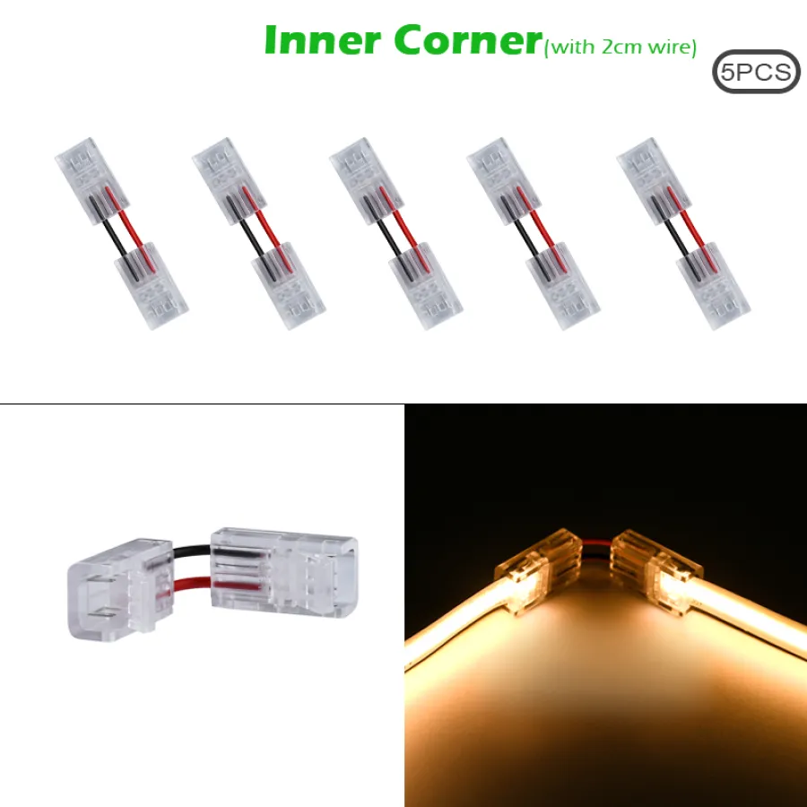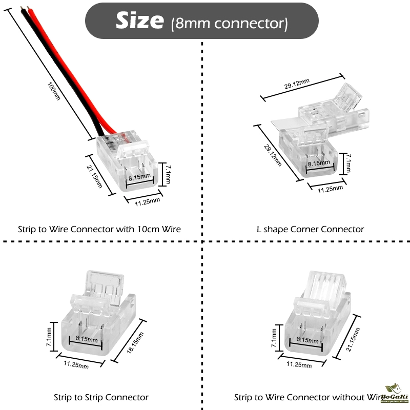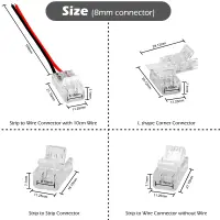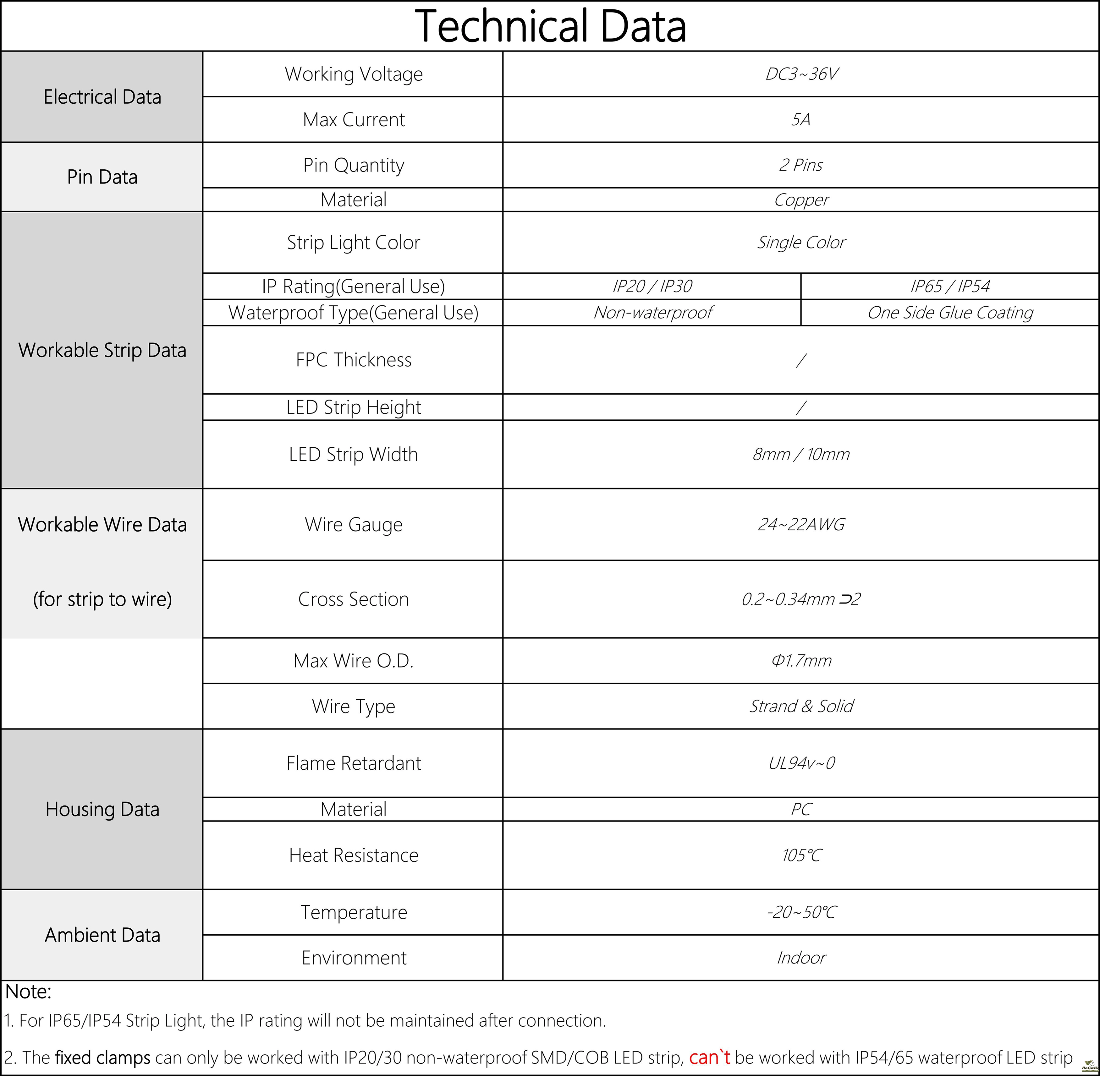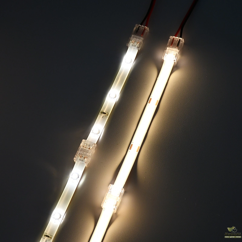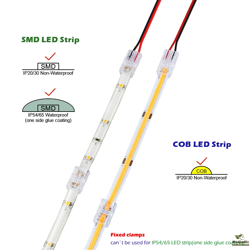 Connectors: Universal for IP20/30 non-waterproof(no glue coating) SMD / COB LED strip, IP54/65 waterproof (one side glue coating) SMD LED strip.