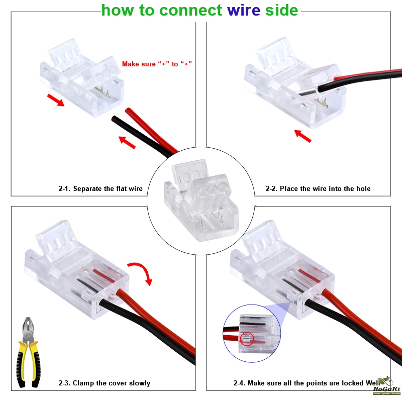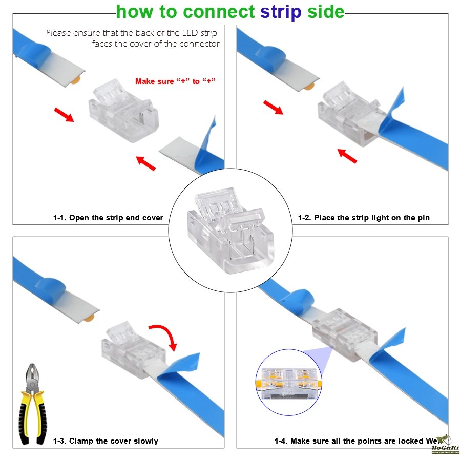 ⑤. Before connecting, please ensure that the positive and negative poles ("+" / "-") of the LED strip on both ends of the connector are consistent