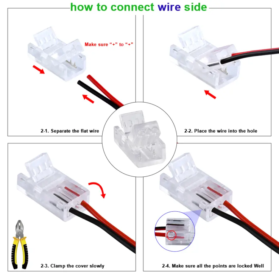 ②. Please ensure that the width of the LED strip is consistent with the width of the connector used (for example, 8mm connectors cannot be used for 10mm or 5mm wide LED strip)