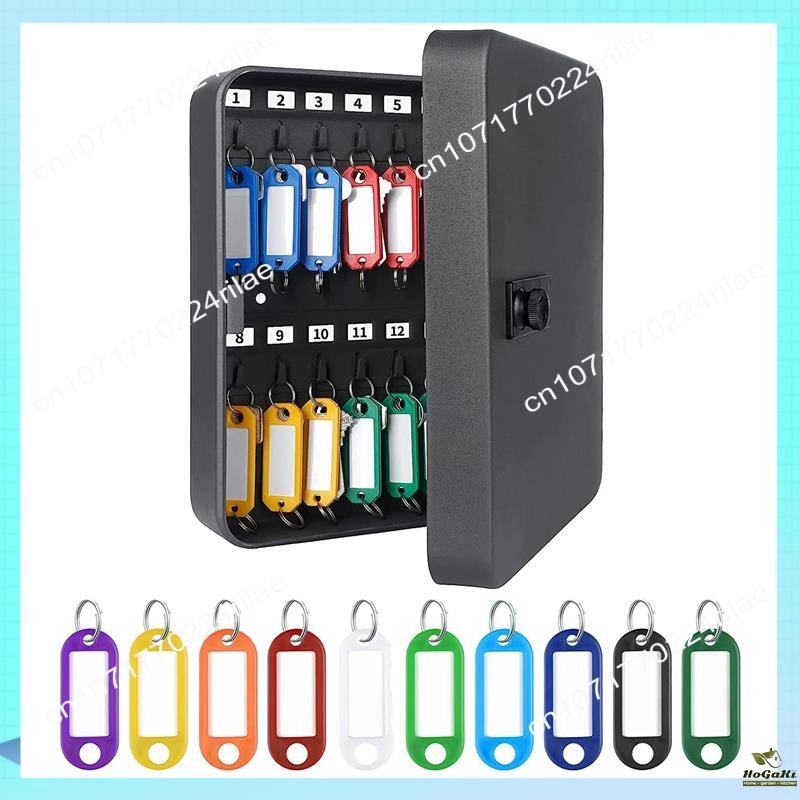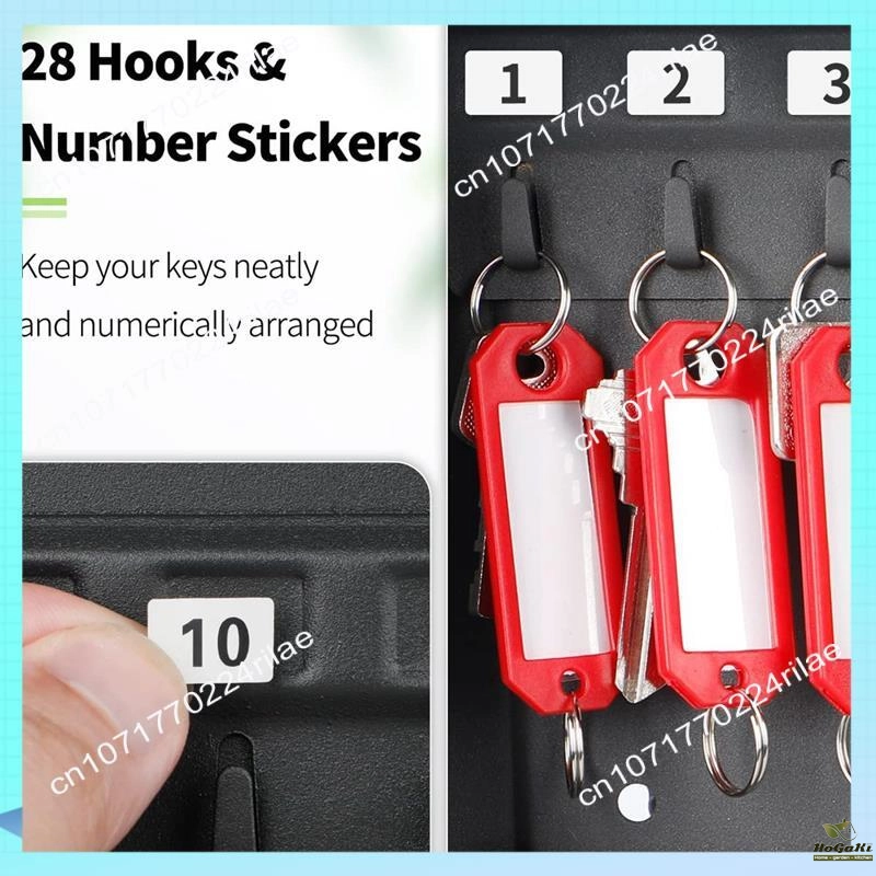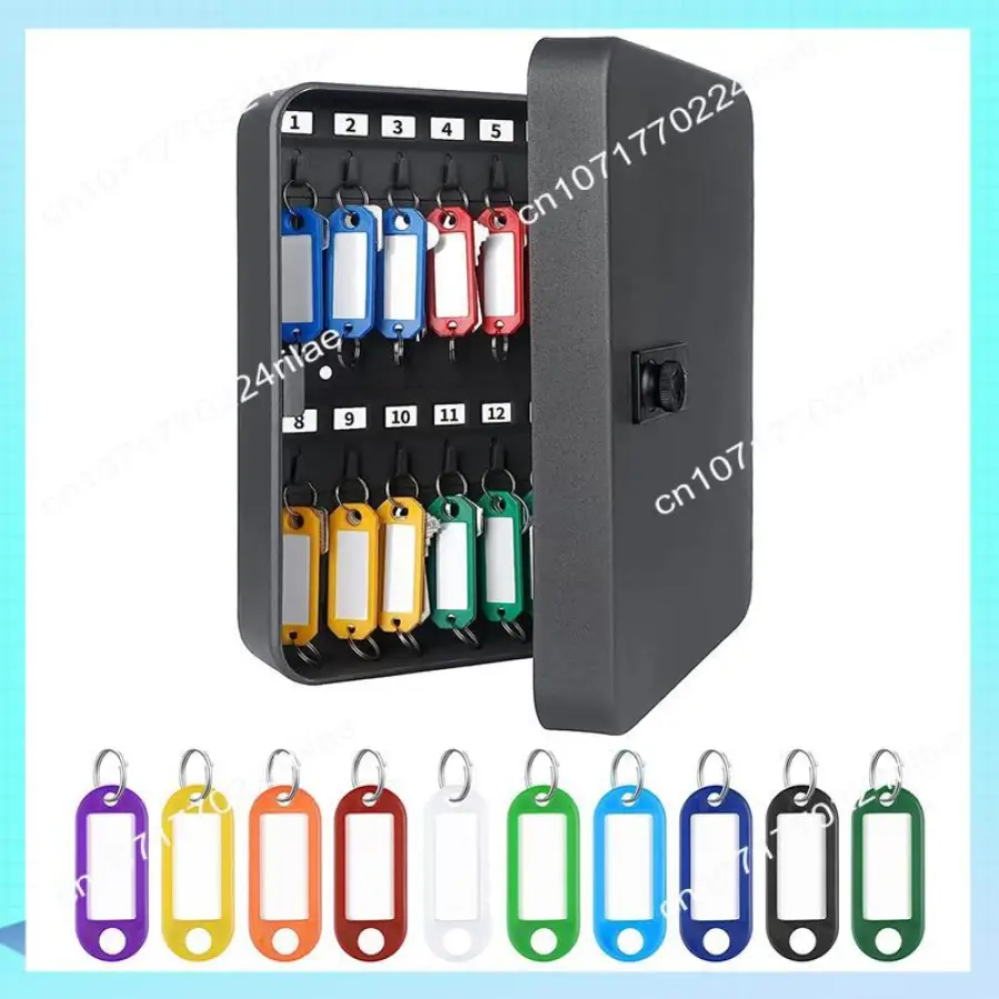 It comes with a steel key cabinet with 28 keys and 40 randomly colored key labels.