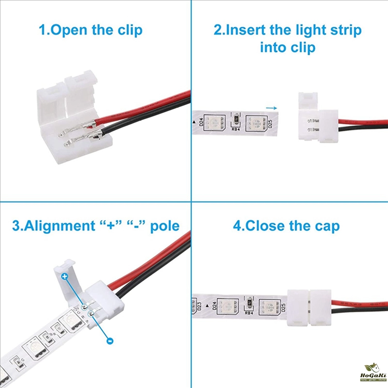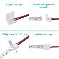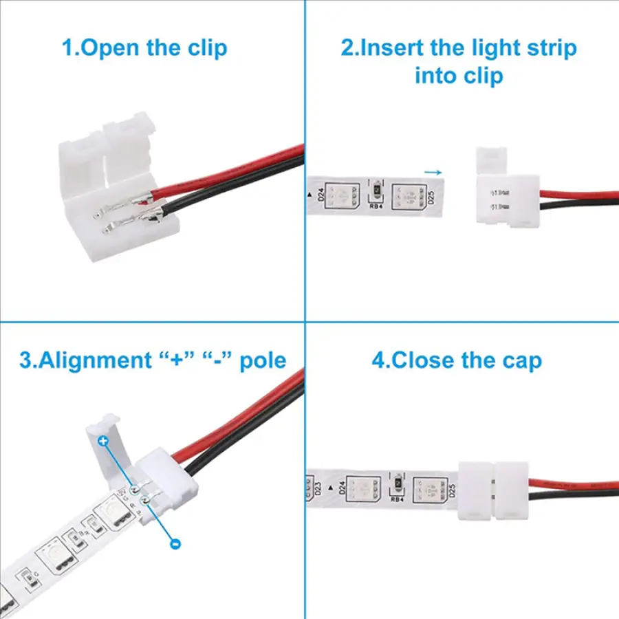 Easy to use: the 8 mm strip connector is easy to use; Just simply open the clasp, and make sure the strip aligns with the connector (match the positive terminals), then slide it underneath the contact prongs; Nice for LED strips in the corner, bedroom, kitchen, bar, makeup mirror, counter and so on