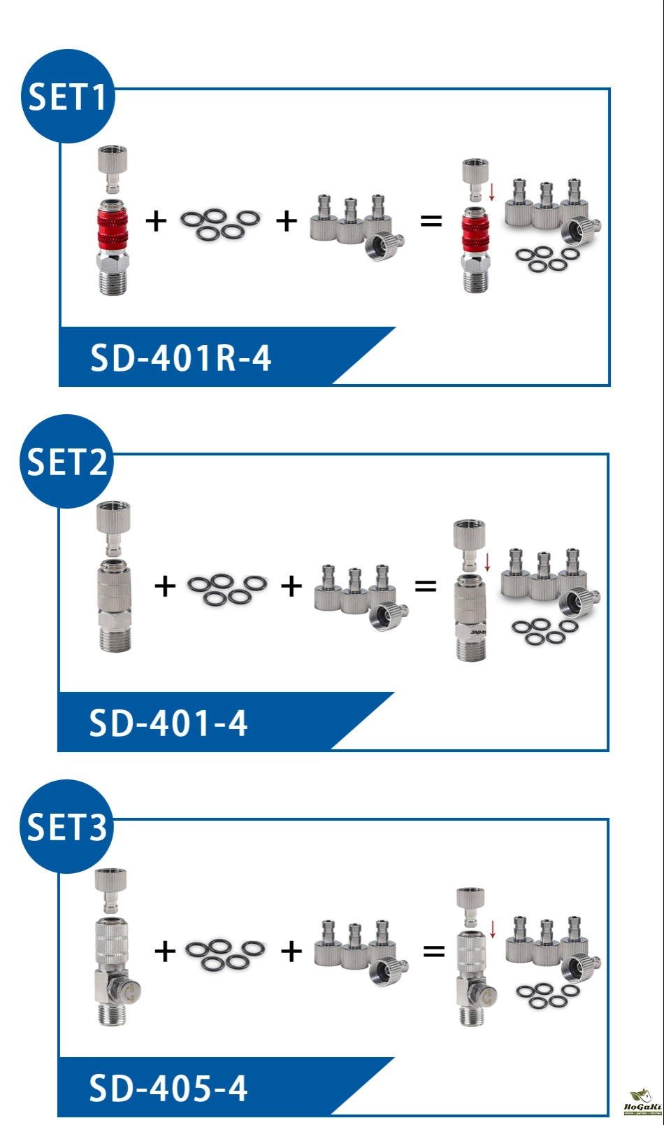 The package come with 1pc air brush quick disconnect adjustment coupler with 1/8” male and 1/8” female, 4pcs female fittings and 5pcs extra O-Ring kit.