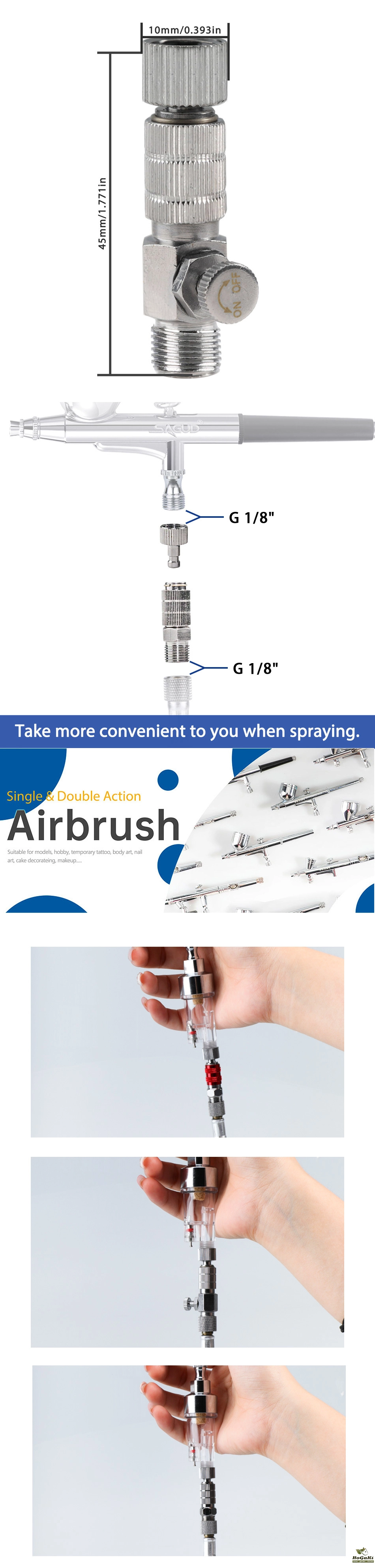 Easy to connect and disconnect airbrush kit without screw trouble. You can change several airbrush guns quickly and easily when you use multiple hot air brushes with singe airbrush hose. Take convenient on air brush with compressor kit, air brush for painting, airbrush makeup, air brush for painting models, airbrush kit for cake decorating and so on.