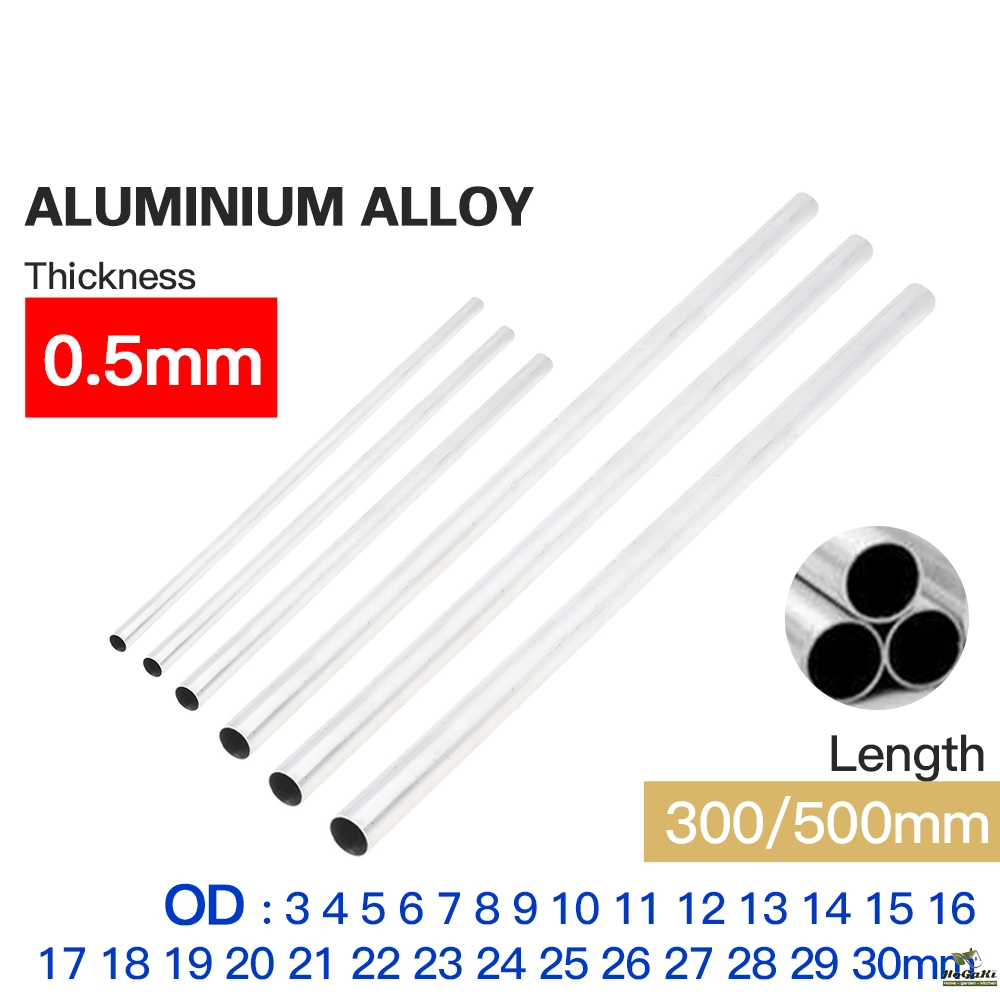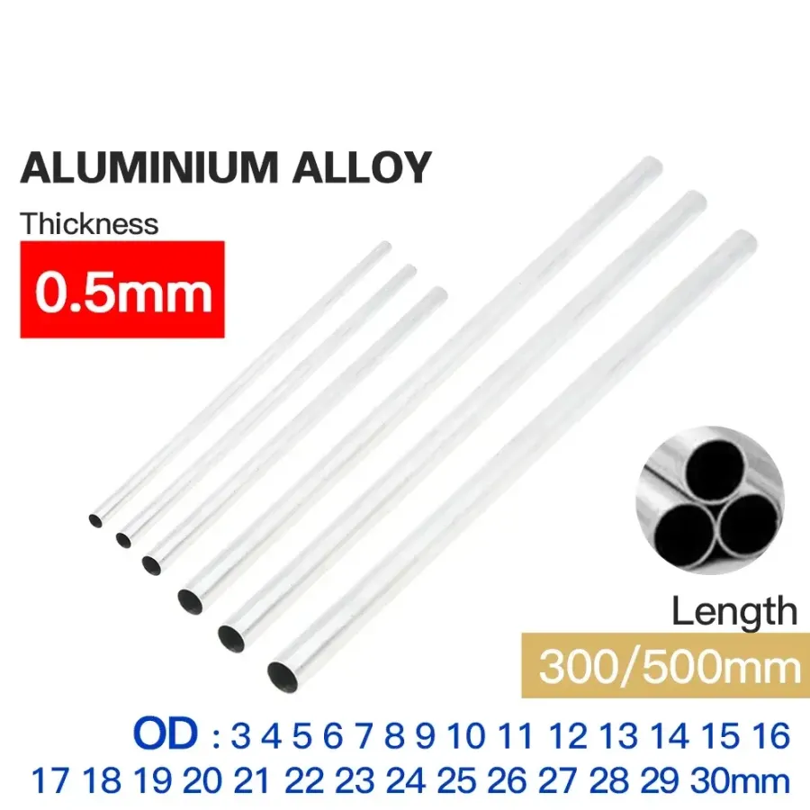 6063 Aluminium Alloy Round Tube, wall thickness 0.5mm;Length 300mm(11.8 inch) ,500mm(19.7 inch);outer diameter( OD) varies from 2mm to 30 mm